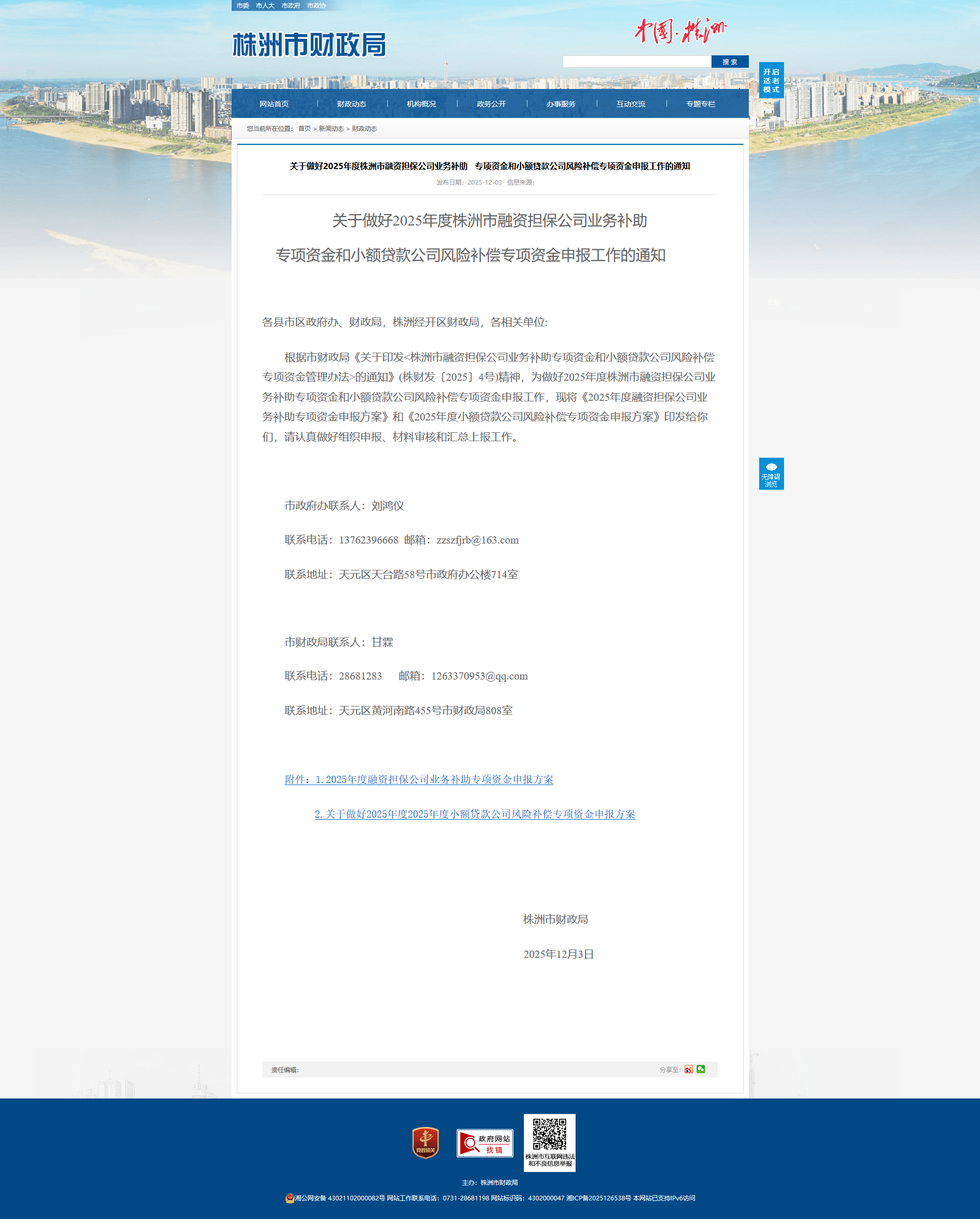 根据市财政局《关于印发<株洲市融资担保公司业务补助专项资金和小额贷款公司风险补偿专项资金管理办法>的通知》(株财发〔2025〕4号)精神,为做好2025年度株洲市融资担保公司业务补助专项资金和小额贷款公司风险补偿专项资金申报工作,现将《2025年度融资担保公司业务补助专项资金申报方案》和《2025年度小额贷款公司风险补偿专项资金申报方案》印发给你们,请认真做好组织申报、材料审核和汇总上报工作。
