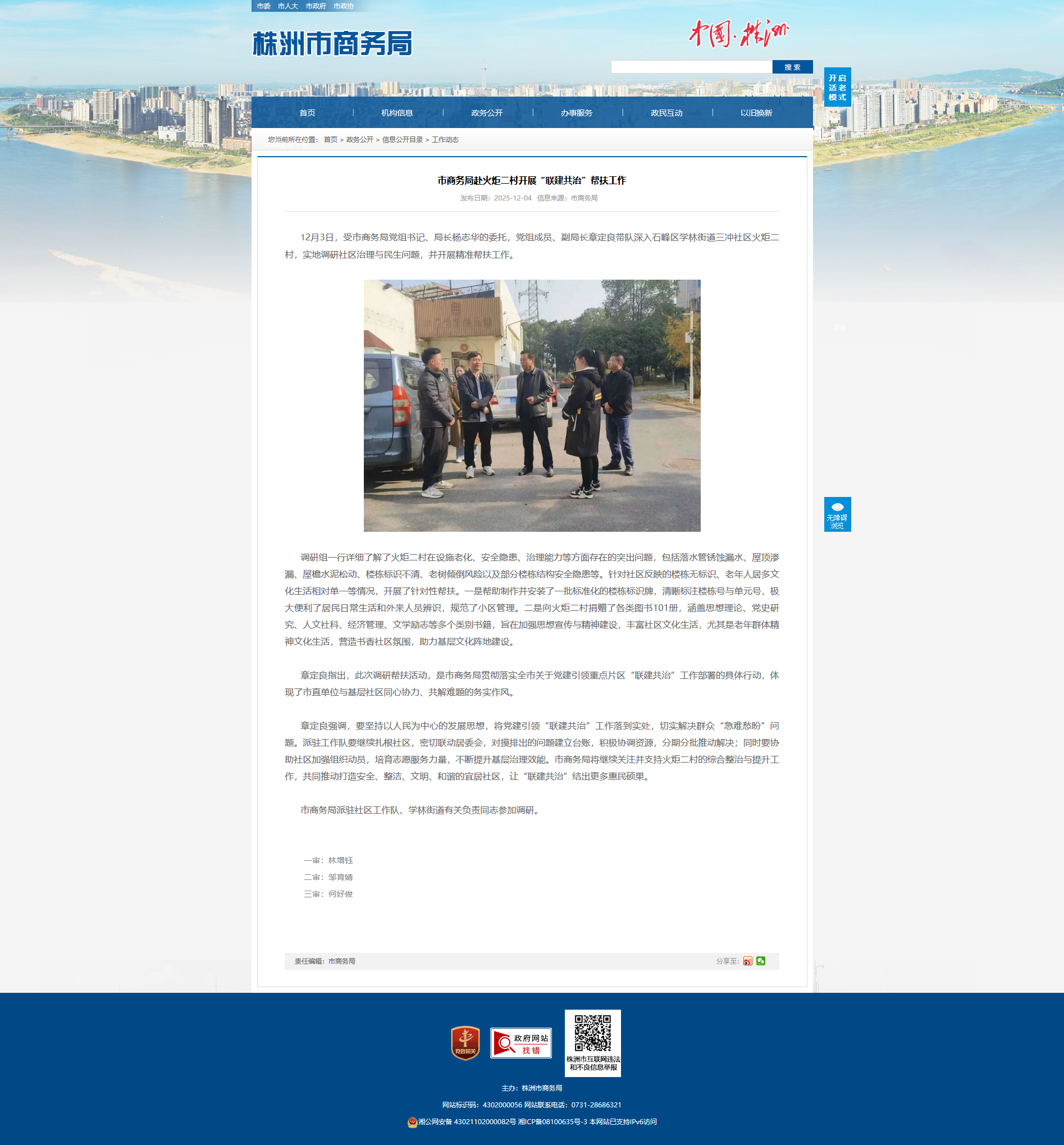 12月3日,受市商务局党组书记、局长杨志华的委托,党组成员、副局长章定良带队深入石峰区学林街道三冲社区火炬二村,实地调研社区治理与民生问题,并开展精准帮扶工作。