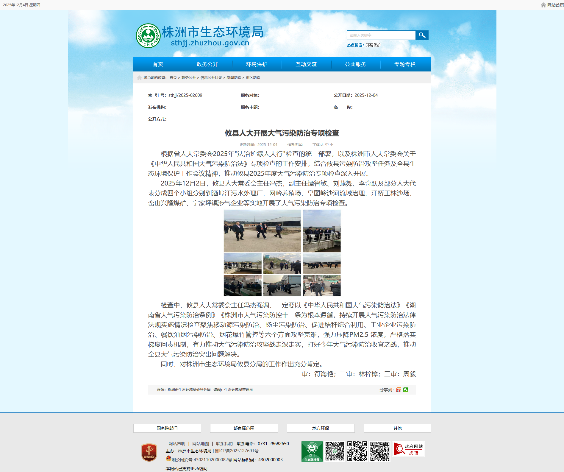 根据省人大常委会2025年"法治护绿人大行"检查的统一部署,以及株洲市人大常委会关于《中华人民共和国大气污染防治法》专项检查的工作安排,结合攸县污染防治攻坚任务及全县生态环境保护工作会议精神,推动攸县2025年度大气污染防治专项检查深入开展。