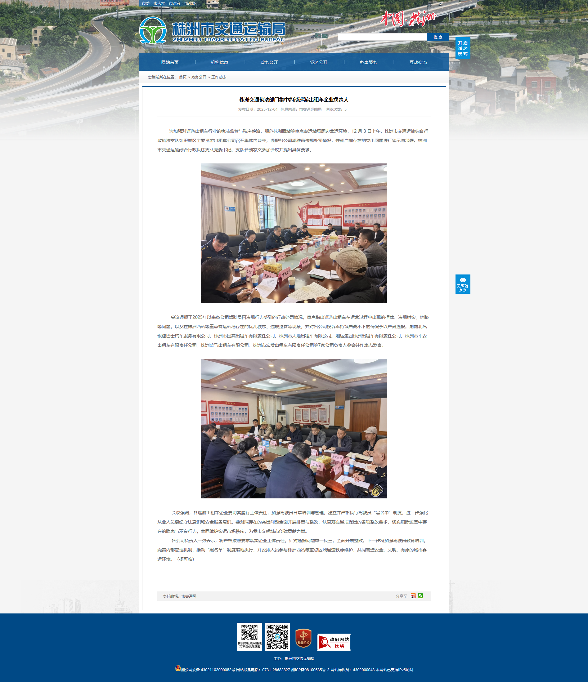 为加强对巡游出租车行业的执法监管与秩序整治,规范株洲西站等重点客运站场周边营运环境,12 月 3 日上午,株洲市交通运输综合行政执法支队组织城区主要巡游出租车公司召开集体约谈会,通报各公司驾驶员违规处罚情况,并就当前存在的突出问题进行警示与部署。株洲市交通运输综合行政执法支队党委书记、支队长刘家文参加会议并提出具体要求。