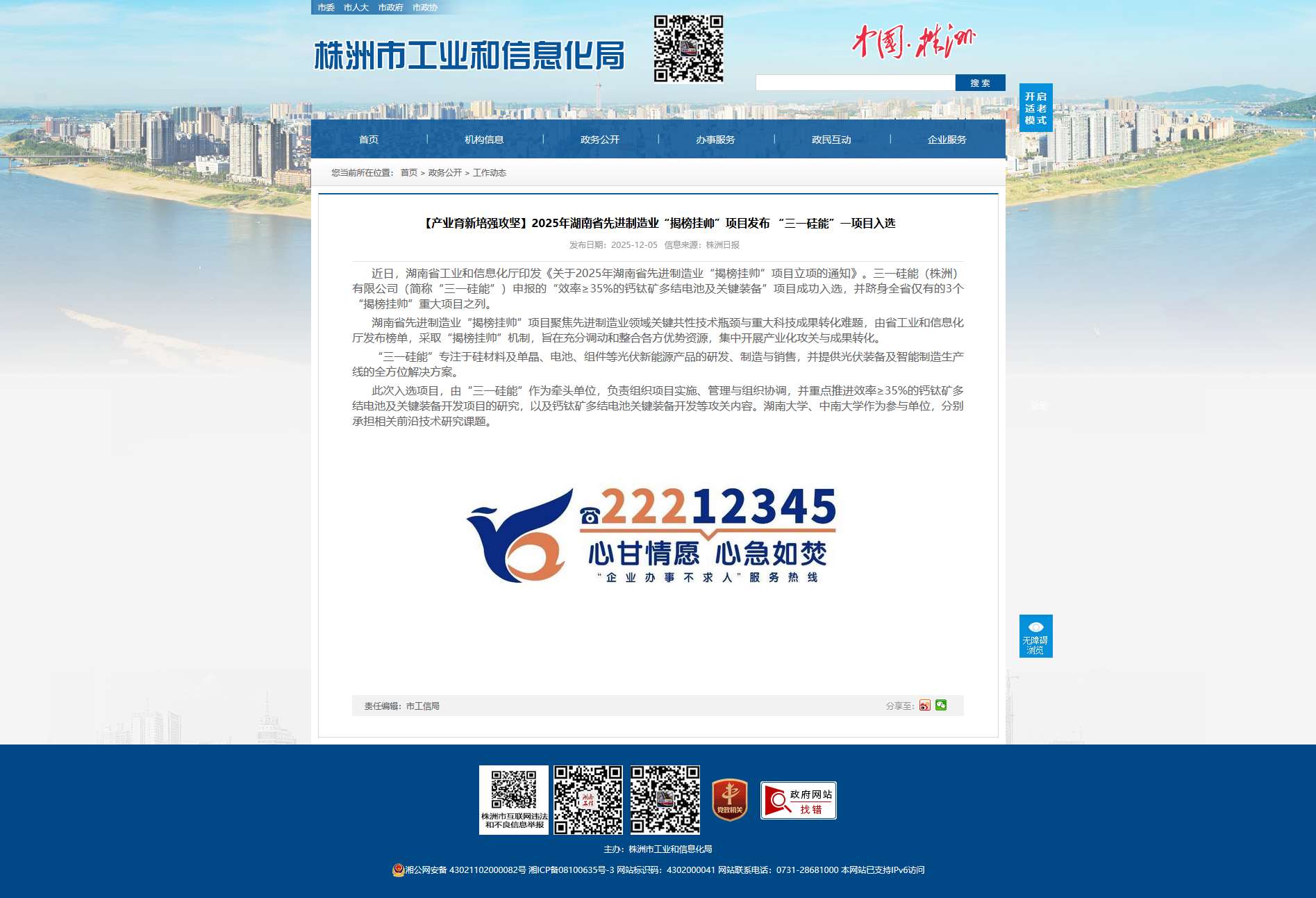 近日,湖南省工业和信息化厅印发《关于2025年湖南省先进制造业“揭榜挂帅”项目立项的通知》。三一硅能(株洲)有限公司(简称“三一硅能”)申报的“效率≥35%的钙钛矿多结电池及关键装备”项目成功入选,并跻身全省仅有的3个“揭榜挂帅”重大项目之列。