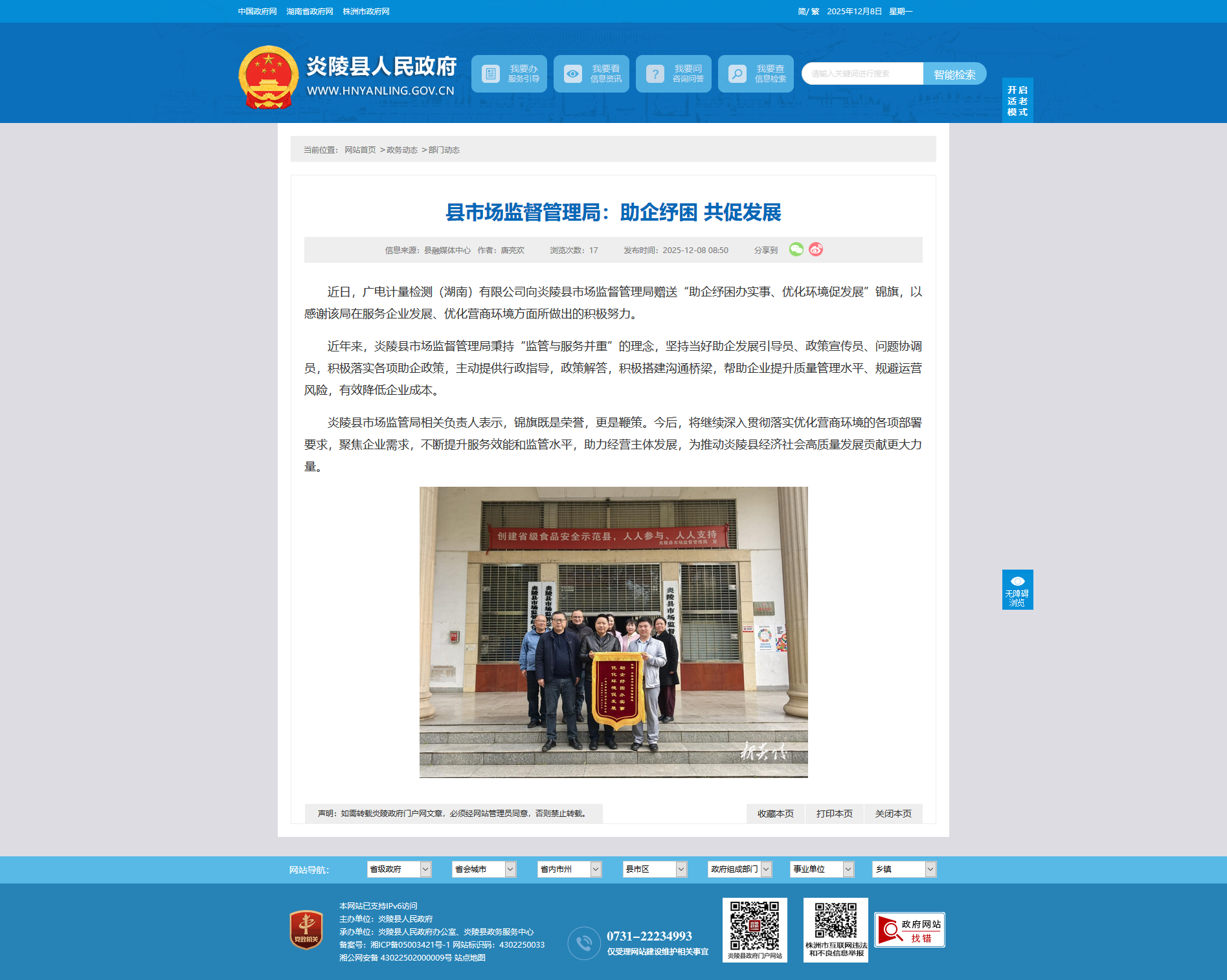 近日,广电计量检测(湖南)有限公司向炎陵县市场监督管理局赠送“助企纾困办实事、优化环境促发展”锦旗,以感谢该局在服务企业发展、优化营商环境方面所做出的积极努力。