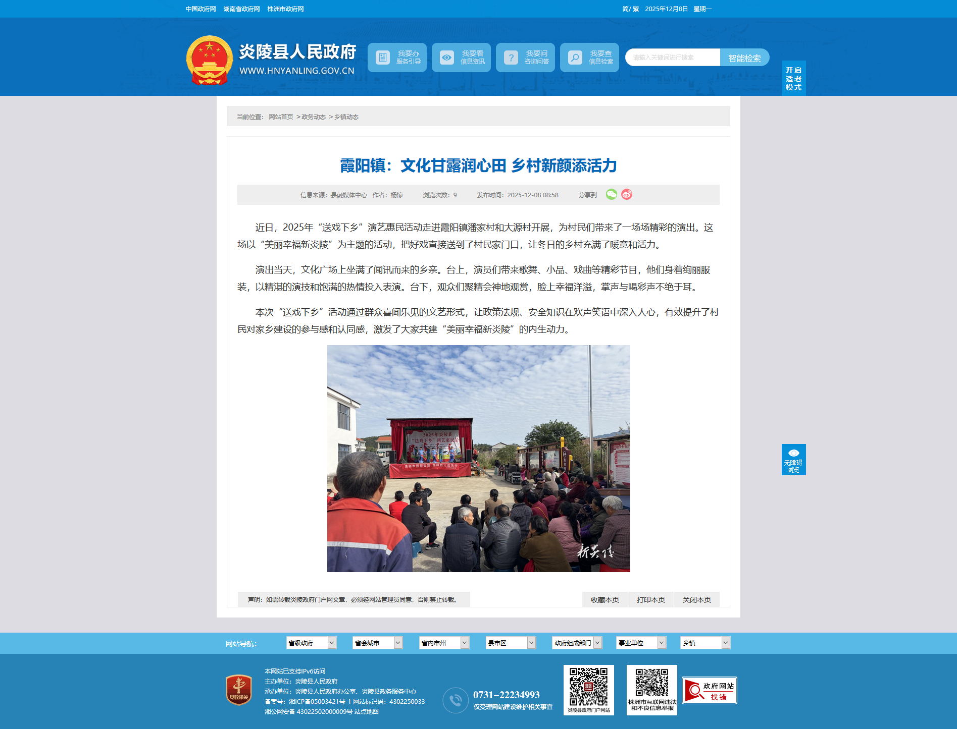 近日,2025年“送戏下乡”演艺惠民活动走进霞阳镇潘家村和大源村开展,为村民们带来了一场场精彩的演出。这场以“美丽幸福新炎陵”为主题的活动,把好戏直接送到了村民家门口,让冬日的乡村充满了暖意和活力。