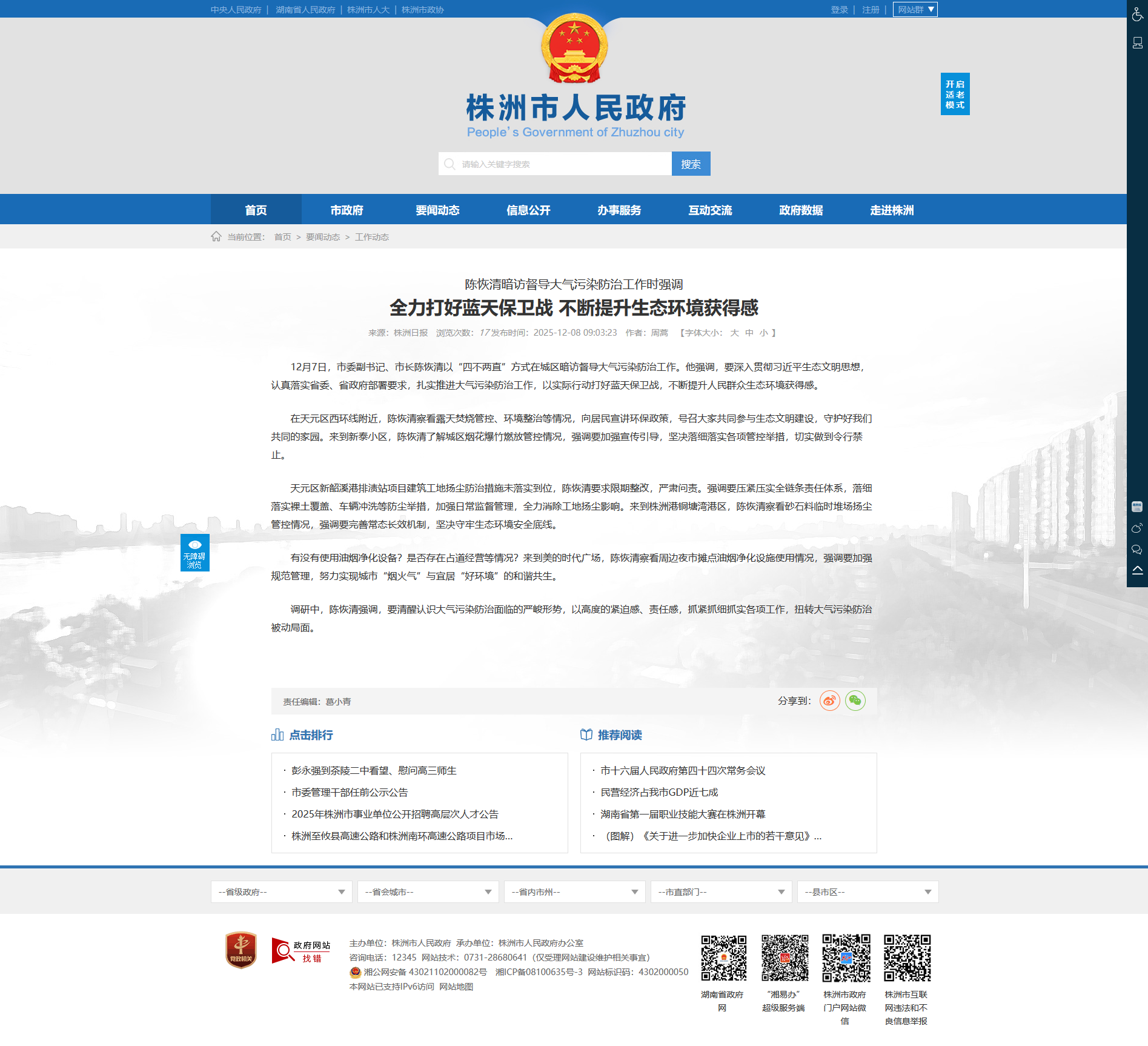 在天元区西环线附近,陈恢清察看露天焚烧管控、环境整治等情况,向居民宣讲环保政策,号召大家共同参与生态文明建设,守护好我们共同的家园。来到新泰小区,陈恢清了解城区烟花爆竹燃放管控情况,强调要加强宣传引导,坚决落细落实各项管控举措,切实做到令行禁止。
