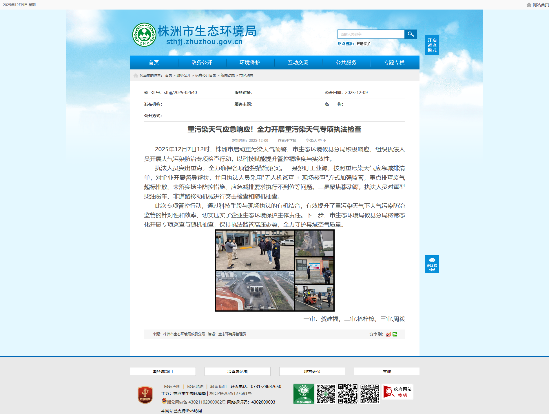 2025年12月7日12时,株洲市启动重污染天气预警,市生态环境攸县分局积极响应,组织执法人员开展大气污染防治专项检查行动,以科技赋能提升管控精准度与实效性。