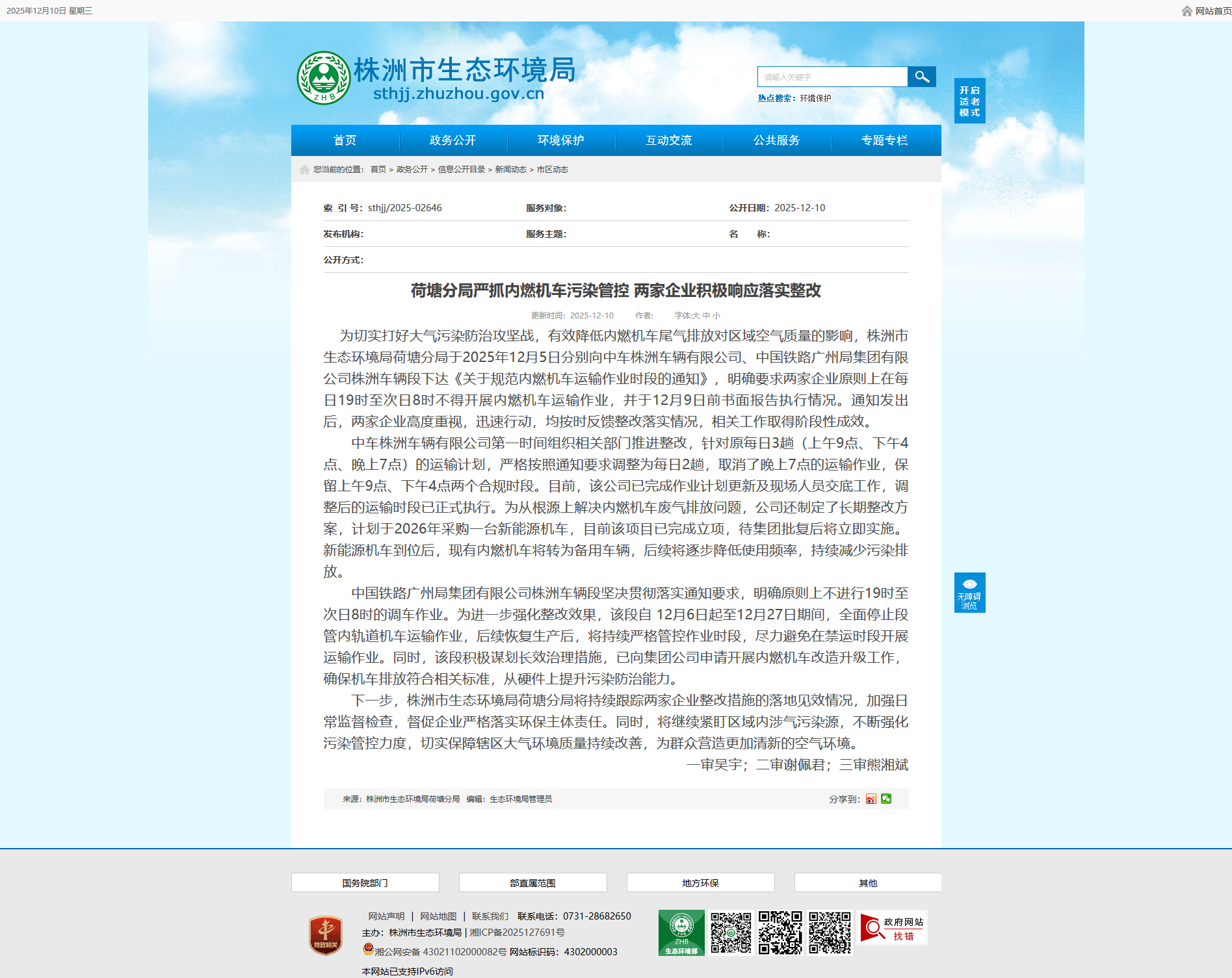 为切实打好大气污染防治攻坚战,有效降低内燃机车尾气排放对区域空气质量的影响,株洲市生态环境局荷塘分局于2025年12月5日分别向中车株洲车辆有限公司、中国铁路广州局集团有限公司株洲车辆段下达《关于规范内燃机车运输作业时段的通知》,明确要求两家企业原则上在每日19时至次日8时不得开展内燃机车运输作业,并于12月9日前书面报告执行情况。通知发出后,两家企业高度重视,迅速行动,均按时反馈整改落实情况,相关工作取得阶段性成效。
