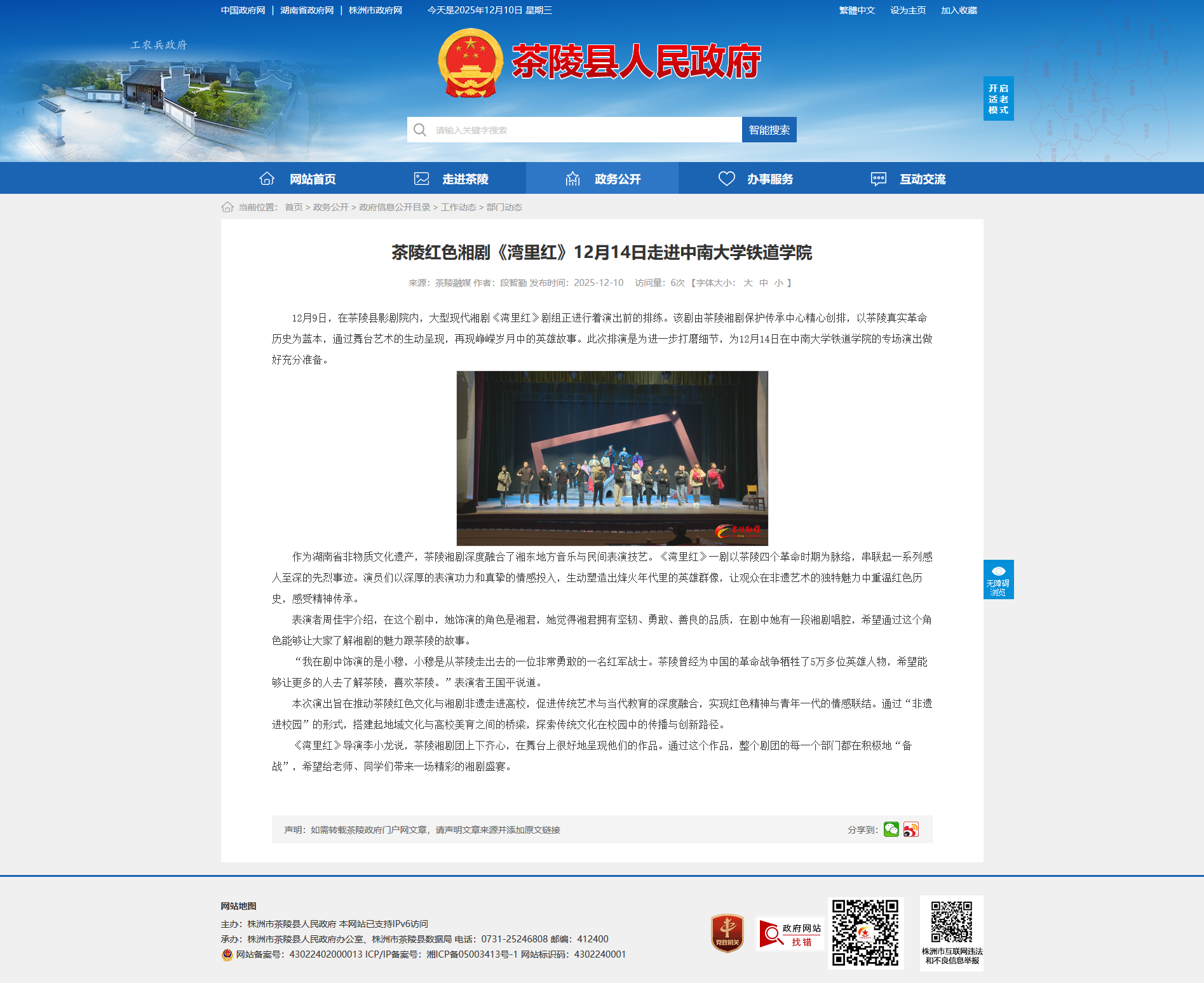 本次演出旨在推动茶陵红色文化与湘剧非遗走进高校,促进传统艺术与当代教育的深度融合,实现红色精神与青年一代的情感联结。通过“非遗进校园”的形式,搭建起地域文化与高校美育之间的桥梁,探索传统文化在校园中的传播与创新路径。