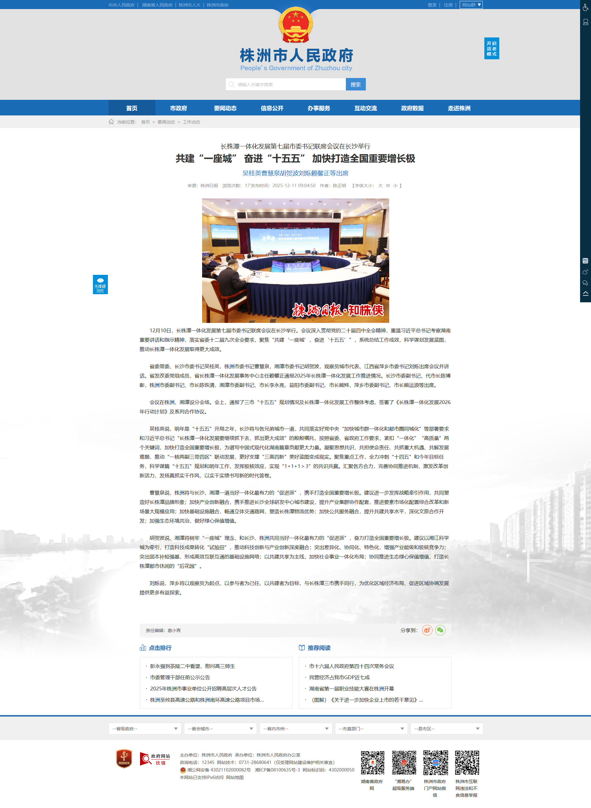 省委常委、长沙市委书记吴桂英,株洲市委书记曹慧泉,湘潭市委书记胡贺波,观察员城市代表、江西省萍乡市委书记刘烁出席会议并讲话。省发改委党组成员、省长株潭一体化发展事务中心主任赖馨正通报2025年长株潭一体化发展工作推进情况。长沙市委副书记、代市长陈博彰,株洲市委副书记、市长陈恢清,湘潭市委副书记、市长李永亮,益阳市委副书记、市长熊炜,萍乡市委副书记、市长熊运浪等出席。