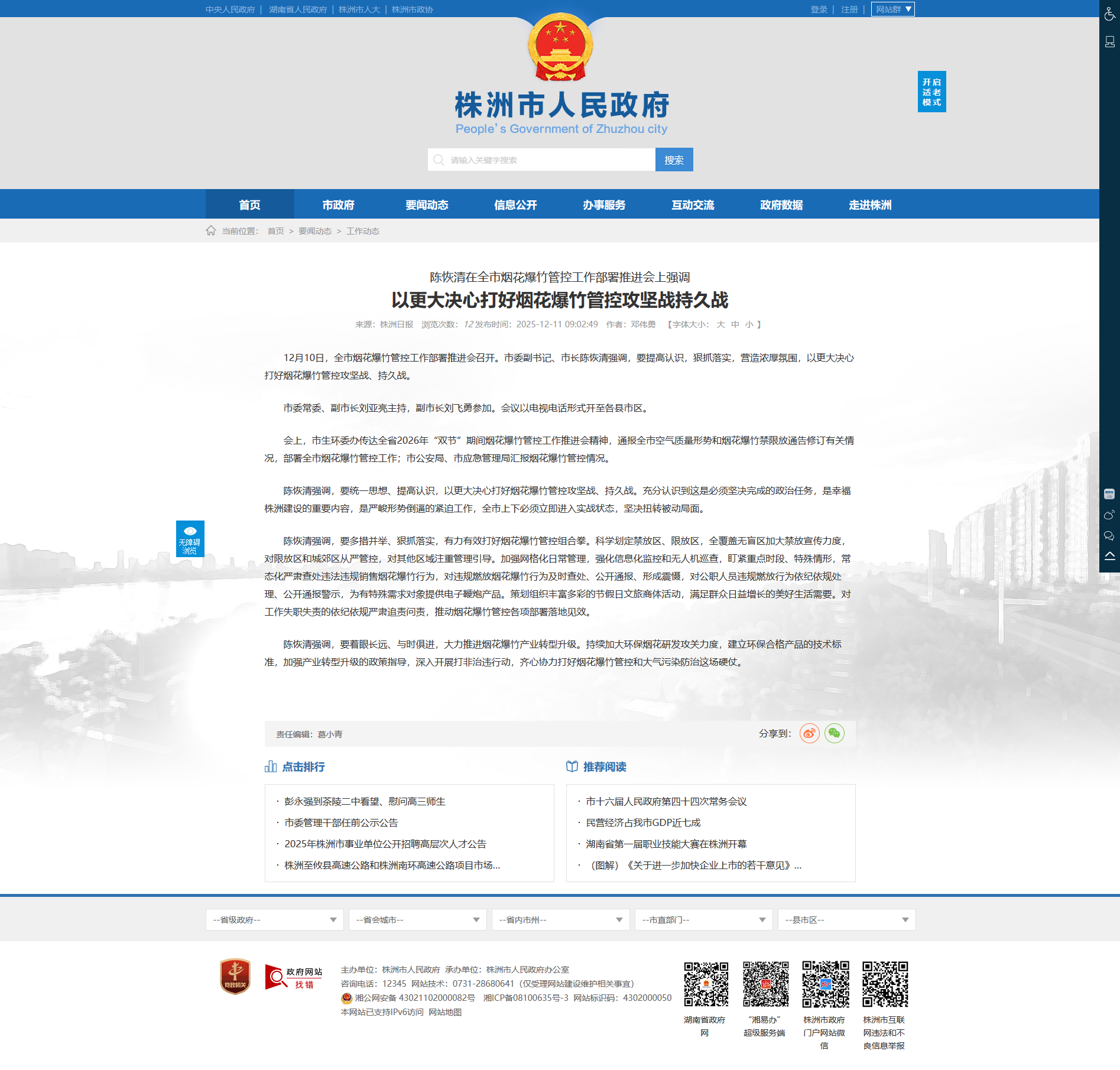 陈恢清强调,要统一思想、提高认识,以更大决心打好烟花爆竹管控攻坚战、持久战。充分认识到这是必须坚决完成的政治任务,是幸福株洲建设的重要内容,是严峻形势倒逼的紧迫工作,全市上下必须立即进入实战状态,坚决扭转被动局面。