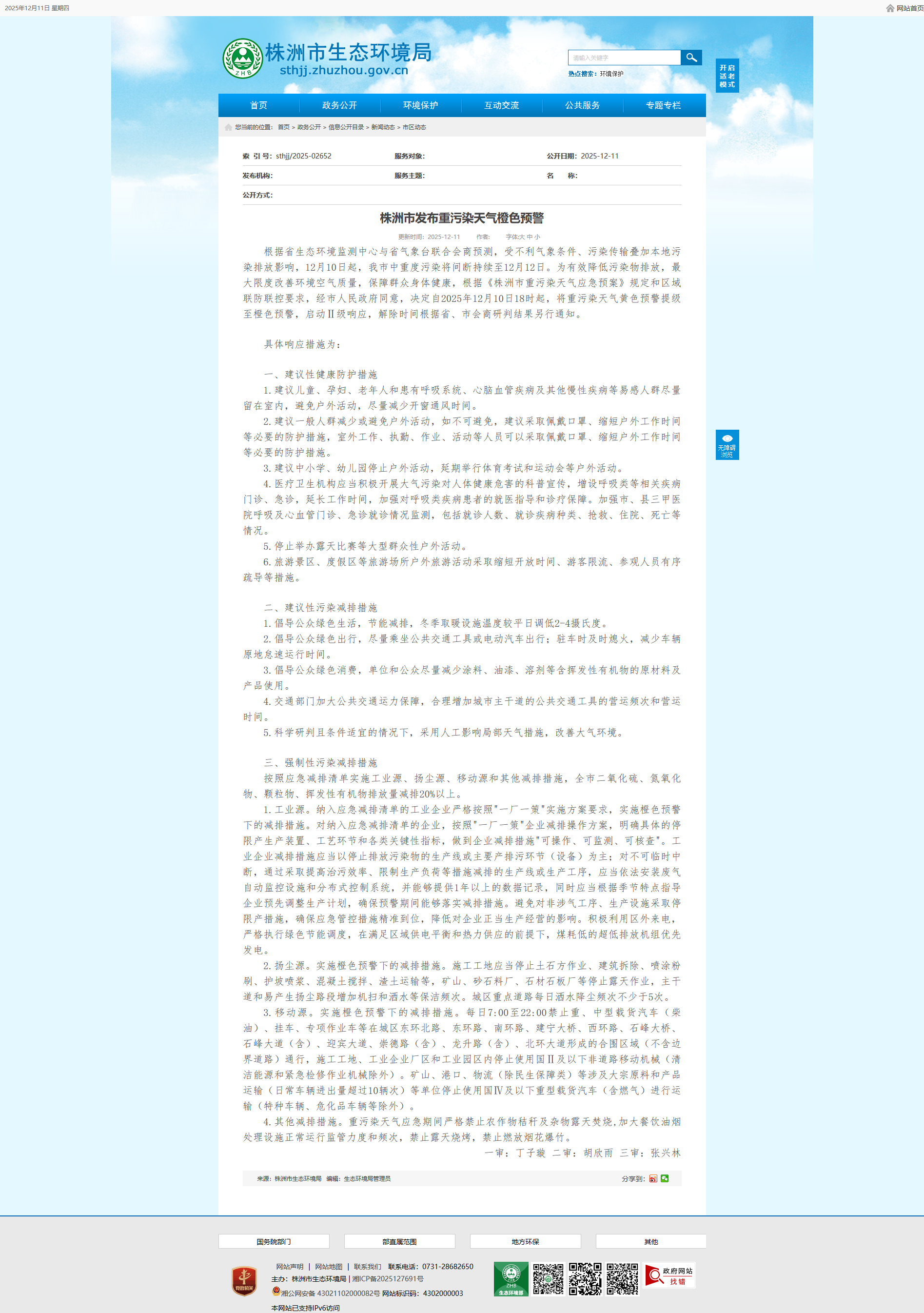 根据省生态环境监测中心与省气象台联合会商预测,受不利气象条件、污染传输叠加本地污染排放影响,12月10日起,我市中重度污染将间断持续至12月12日。为有效降低污染物排放,最大限度改善环境空气质量,保障群众身体健康,根据《株洲市重污染天气应急预案》规定和区域联防联控要求,经市人民政府同意,决定自2025年12月10日18时起,将重污染天气黄色预警提级至橙色预警,启动Ⅱ级响应,解除时间根据省、市会商研判结果另行通知。