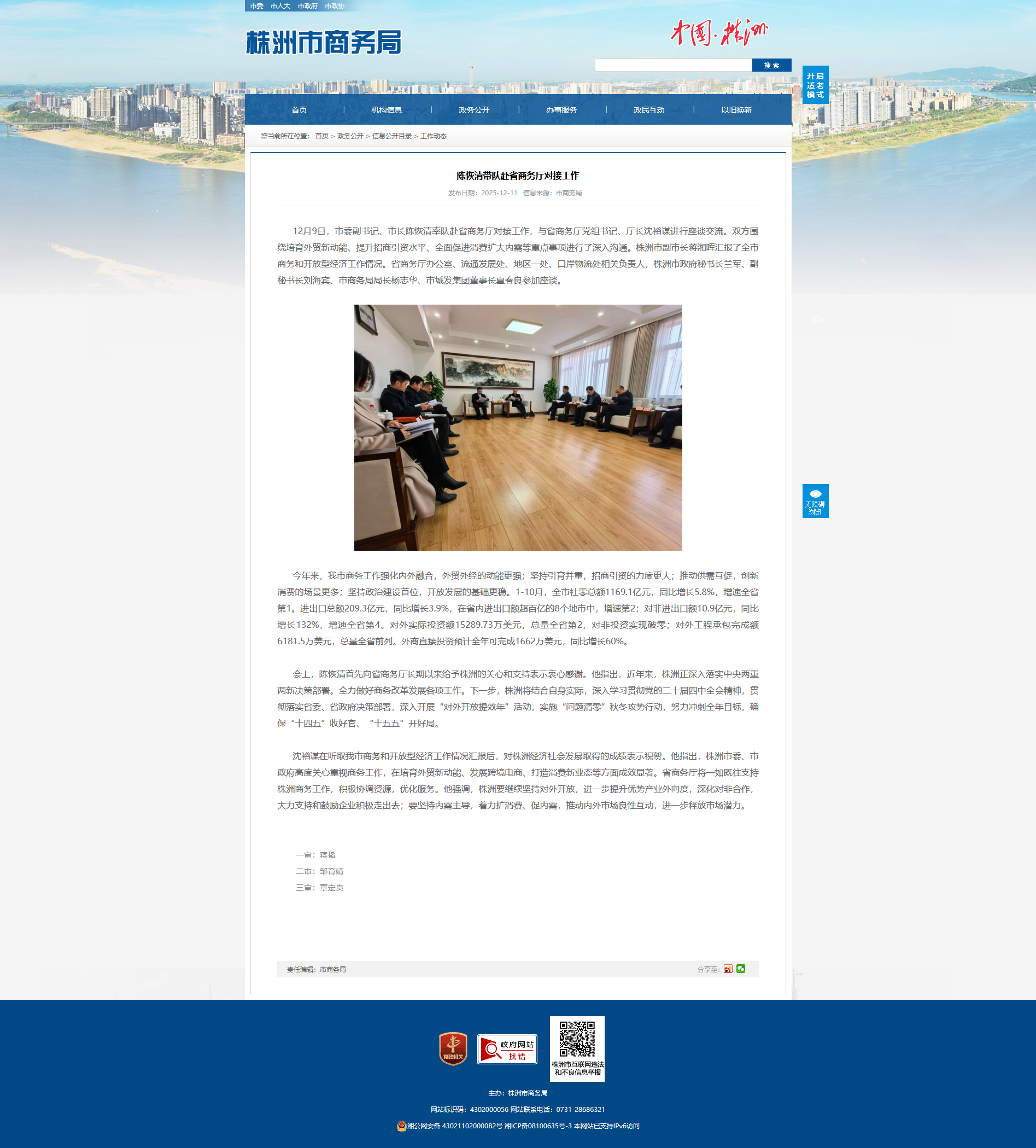 会上,陈恢清首先向省商务厅长期以来给予株洲的关心和支持表示衷心感谢。他指出,近年来,株洲正深入落实中央两重两新决策部署。全力做好商务改革发展各项工作。下一步,株洲将结合自身实际,深入学习贯彻党的二十届四中全会精神,贯彻落实省委、省政府决策部署,深入开展“对外开放提效年”活动,实施“问题清零”秋冬攻势行动,努力冲刺全年目标,确保“十四五”收好官、“十五五”开好局。