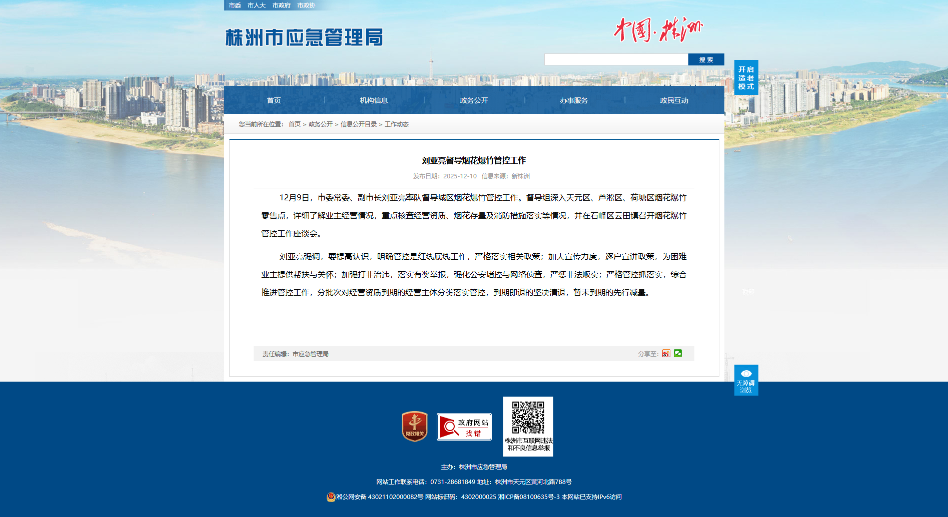 12月9日,市委常委、副市长刘亚亮率队督导城区烟花爆竹管控工作。督导组深入天元区、芦淞区、荷塘区烟花爆竹零售点,详细了解业主经营情况,重点核查经营资质、烟花存量及消防措施落实等情况,并在石峰区云田镇召开烟花爆竹管控工作座谈会。