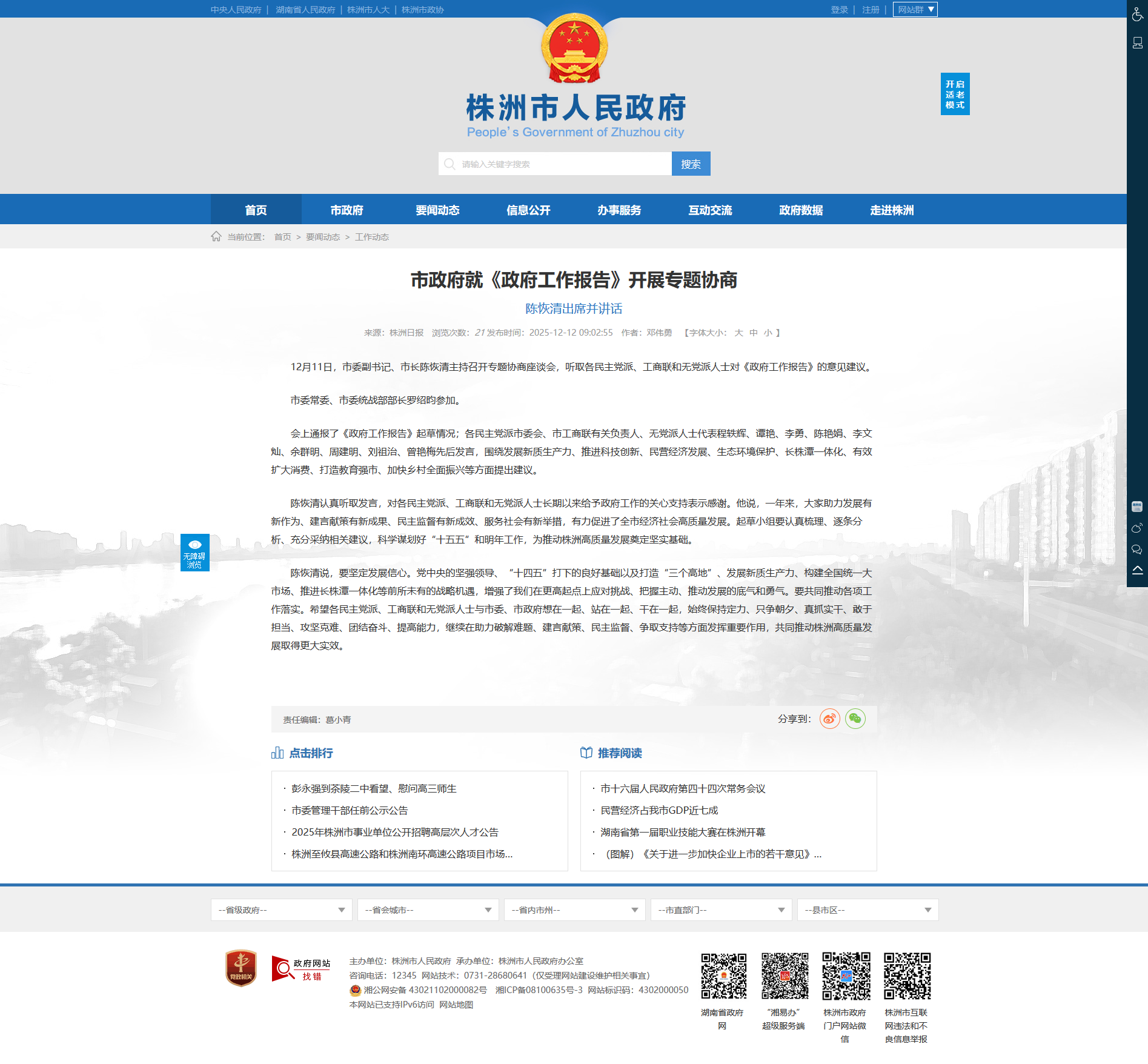 陈恢清认真听取发言,对各民主党派、工商联和无党派人士长期以来给予政府工作的关心支持表示感谢。他说,一年来,大家助力发展有新作为、建言献策有新成果、民主监督有新成效、服务社会有新举措,有力促进了全市经济社会高质量发展。起草小组要认真梳理、逐条分析、充分采纳相关建议,科学谋划好“十五五”和明年工作,为推动株洲高质量发展奠定坚实基础。