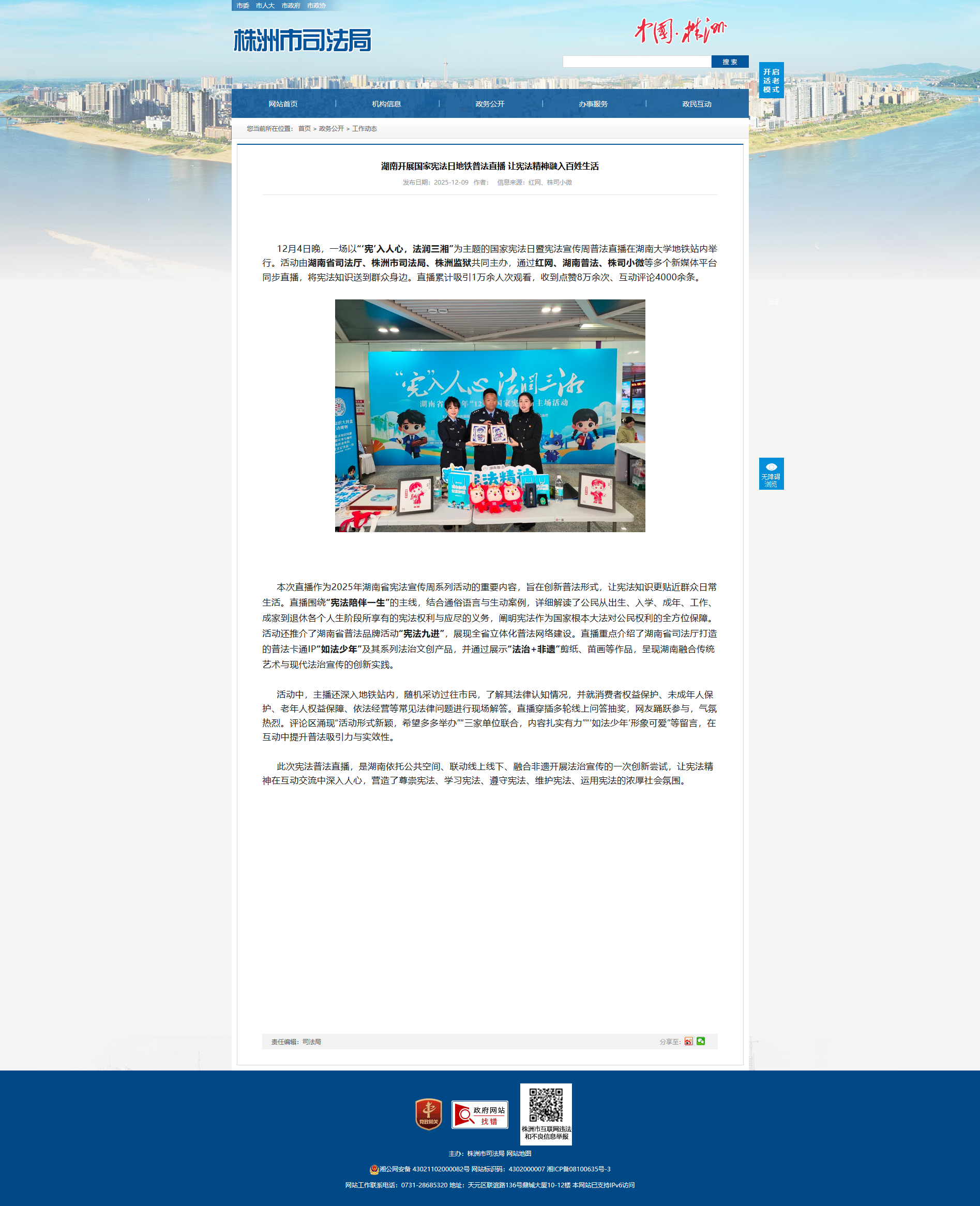 12月4日晚,一场以“‘宪’入人心,法润三湘”为主题的国家宪法日暨宪法宣传周普法直播在湖南大学地铁站内举行。活动由湖南省司法厅、株洲市司法局、株洲监狱共同主办,通过红网、湖南普法、株司小微等多个新媒体平台同步直播,将宪法知识送到群众身边。直播累计吸引1万余人次观看,收到点赞8万余次、互动评论4000余条。