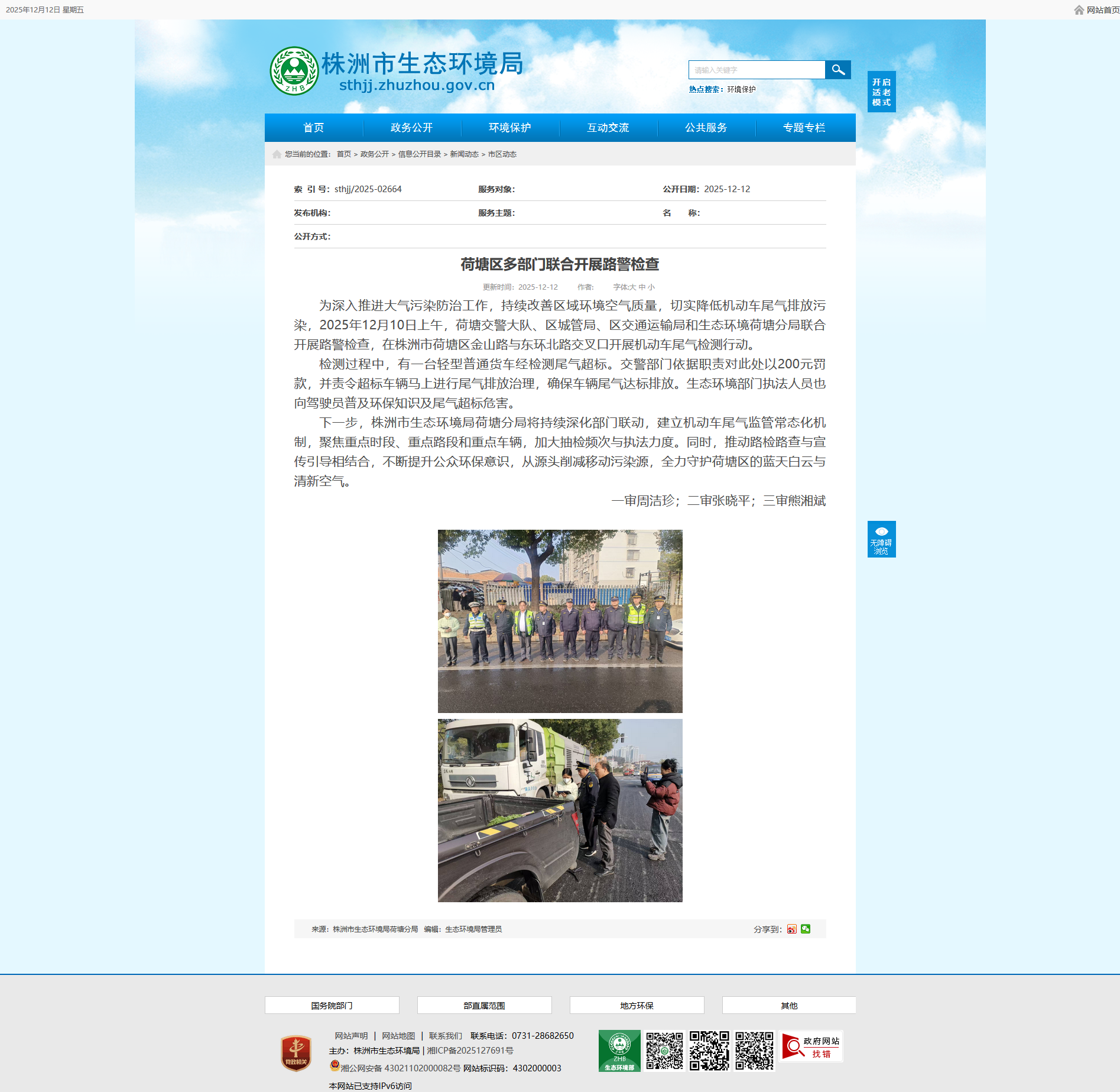 为深入推进大气污染防治工作,持续改善区域环境空气质量,切实降低机动车尾气排放污染,2025年12月10日上午,荷塘交警大队、区城管局、区交通运输局和生态环境荷塘分局联合开展路警检查,在株洲市荷塘区金山路与东环北路交叉口开展机动车尾气检测行动。
