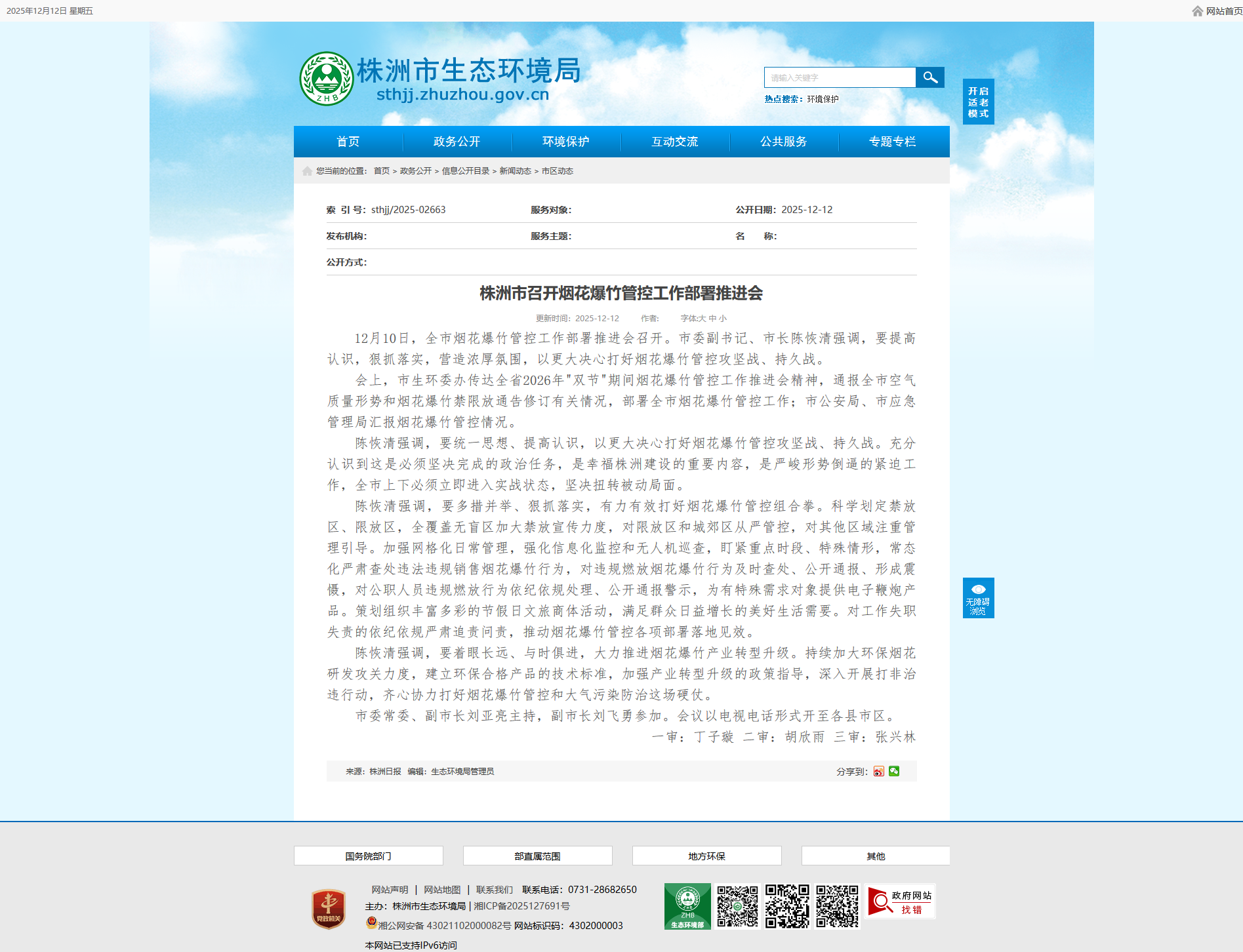 会上,市生环委办传达全省2026年"双节"期间烟花爆竹管控工作推进会精神,通报全市空气质量形势和烟花爆竹禁限放通告修订有关情况,部署全市烟花爆竹管控工作;市公安局、市应急管理局汇报烟花爆竹管控情况。