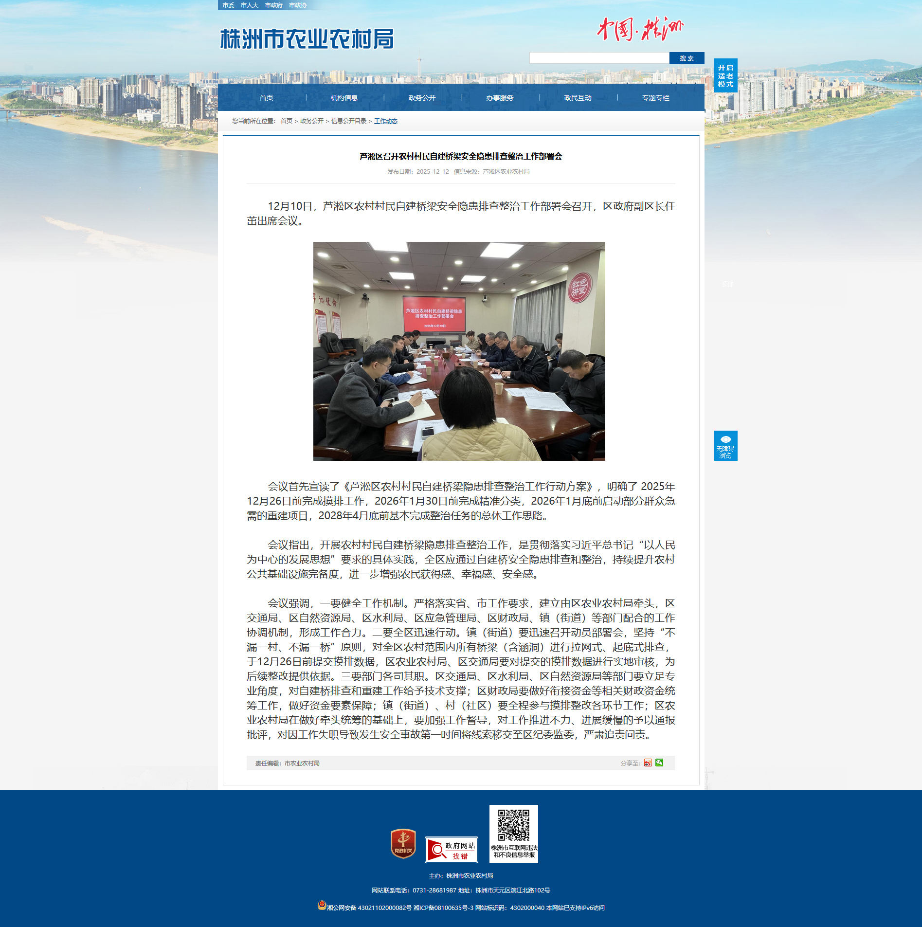 会议首先宣读了《芦淞区农村村民自建桥梁隐患排查整治工作行动方案》,明确了 2025年12月26日前完成摸排工作,2026年1月30日前完成精准分类,2026年1月底前启动部分群众急需的重建项目,2028年4月底前基本完成整治任务的总体工作思路。