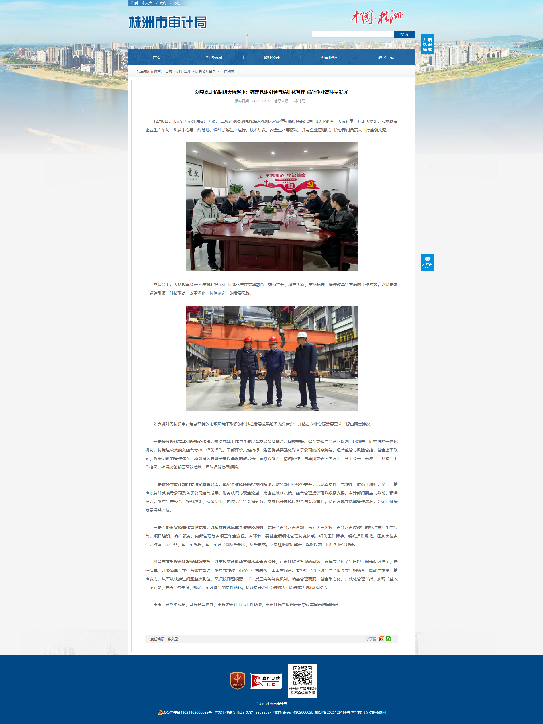 12月8日,市审计局党组书记、局长、二级巡视员刘克胤深入株洲天桥起重机股份有限公司(以下简称“天桥起重”)走访调研,实地察看企业生产车间、研发中心等一线场地,详细了解生产运行、技术研发、安全生产等情况,并与企业管理层、核心部门负责人举行座谈交流。