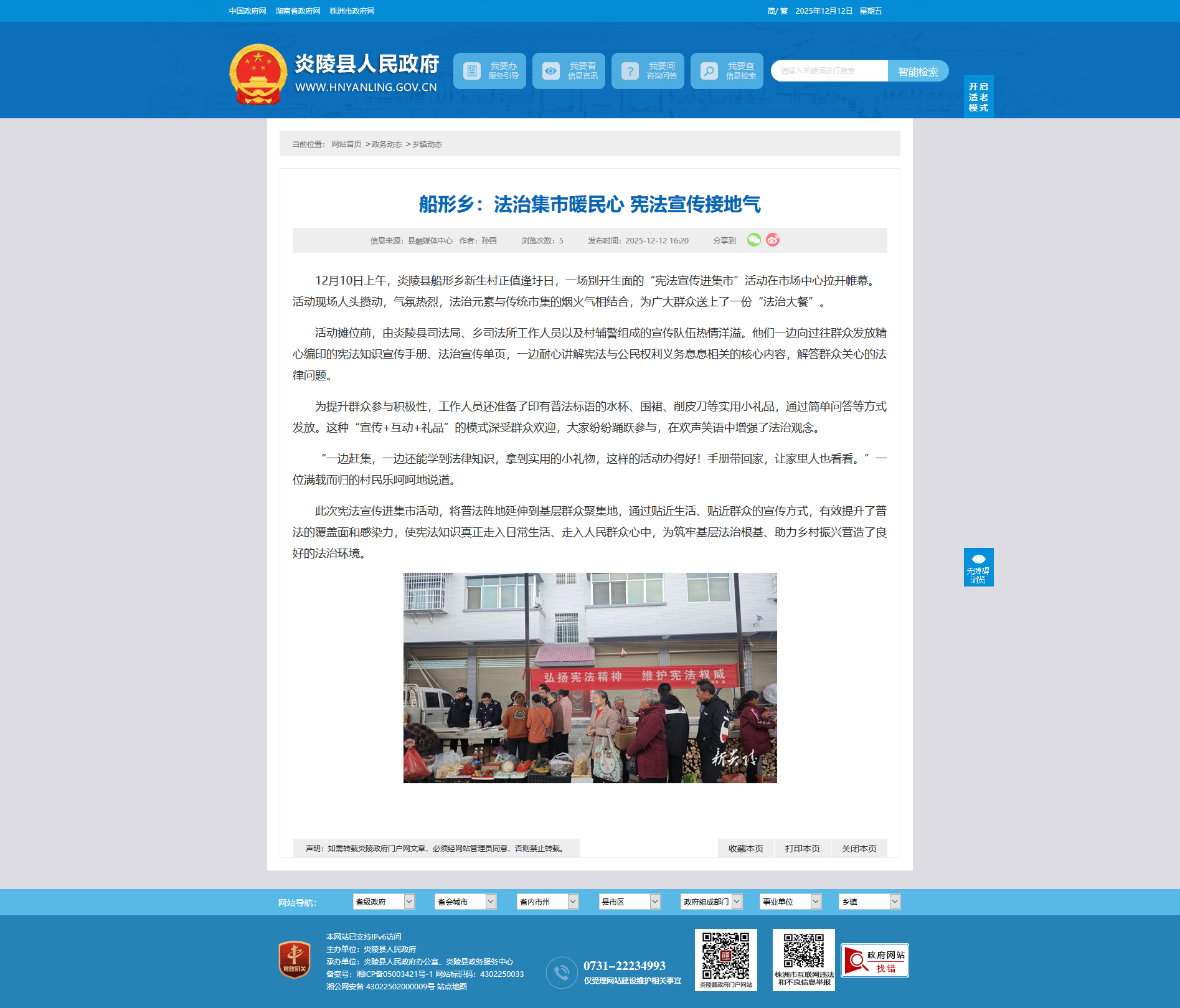 12月10日上午,炎陵县船形乡新生村正值逢圩日,一场别开生面的“宪法宣传进集市”活动在市场中心拉开帷幕。活动现场人头攒动,气氛热烈,法治元素与传统市集的烟火气相结合,为广大群众送上了一份“法治大餐”。