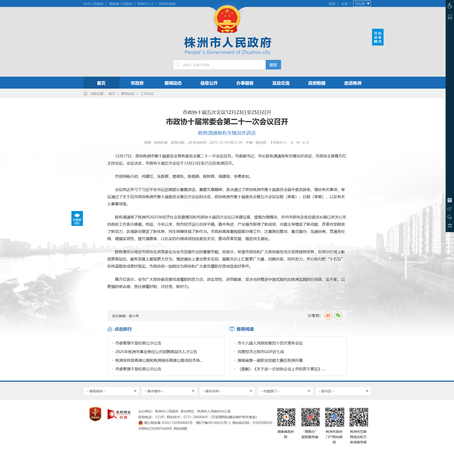 陈恢清通报了株洲市2025年经济社会发展情况和市政协十届四次会议以来建议案、提案办理情况,并向市政协及各位委员长期以来关心支持政府工作表示感谢。他说,今年以来,我市经济运行总体平稳、稳中有进,产业强市取得了新成效,内需主导增添了新动能,改革攻坚释放了新活力,区域联动塑造了新优势,民生保障体现了新作为。市政府高度重视提案办理工作,注重高位推动、重点督办、沟通协商,贯通责任链、增强实效性、提升满意度,以扎实的办理成效回应委员关切、推动改革发展、增进民生福祉。