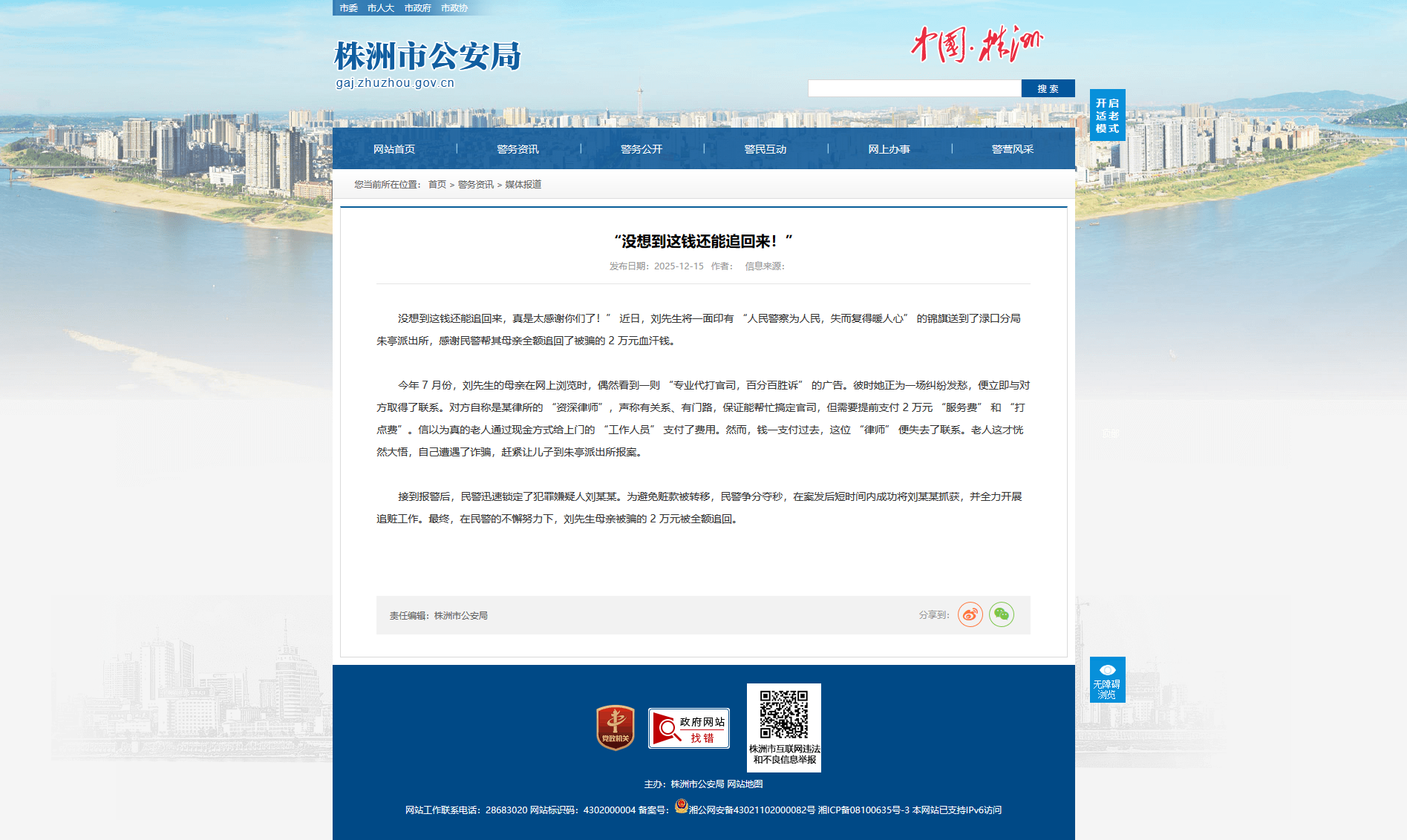 没想到这钱还能追回来,真是太感谢你们了!” 近日,刘先生将一面印有 “人民警察为人民,失而复得暖人心” 的锦旗送到了渌口分局朱亭派出所,感谢民警帮其母亲全额追回了被骗的 2 万元血汗钱。