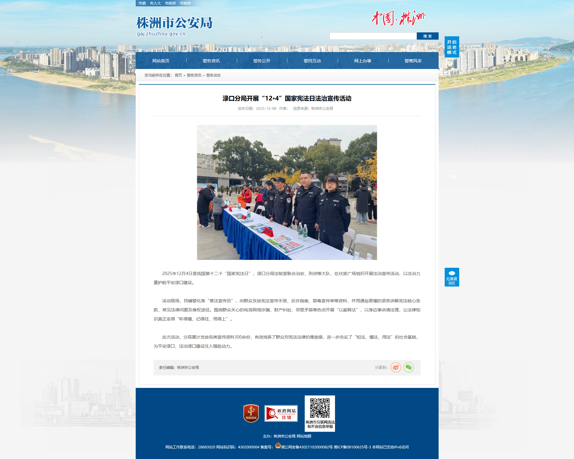 2025年12月4日是我国第十二个“国家宪法日”,渌口分局法制室联合治安、刑侦等大队,在伏波广场组织开展法治宣传活动,以法治力量护航平安渌口建设。