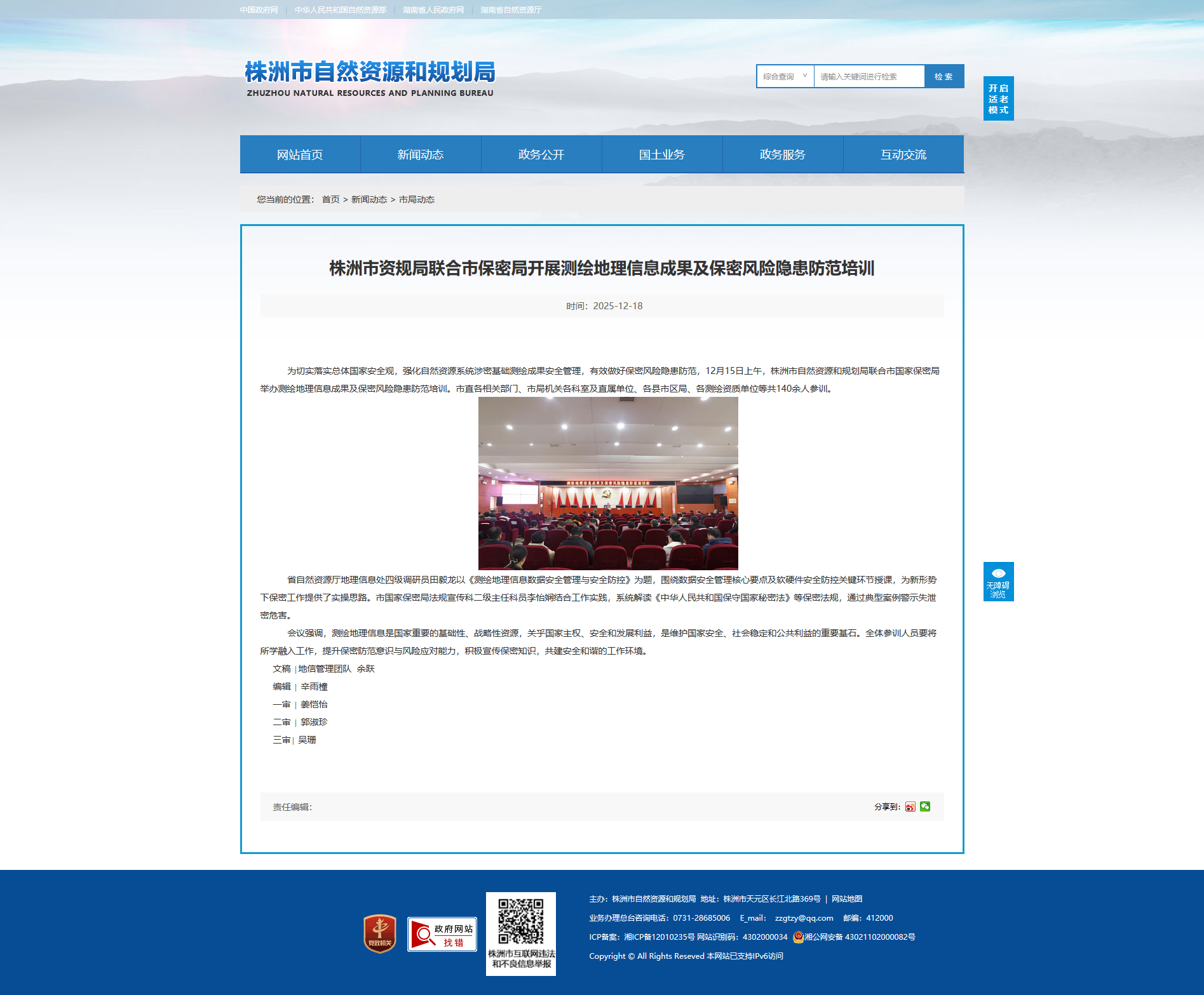 为切实落实总体国家安全观,强化自然资源系统涉密基础测绘成果安全管理,有效做好保密风险隐患防范,12月15日上午,株洲市自然资源和规划局联合市国家保密局举办测绘地理信息成果及保密风险隐患防范培训。市直各相关部门、市局机关各科室及直属单位、各县市区局、各测绘资质单位等共140余人参训。