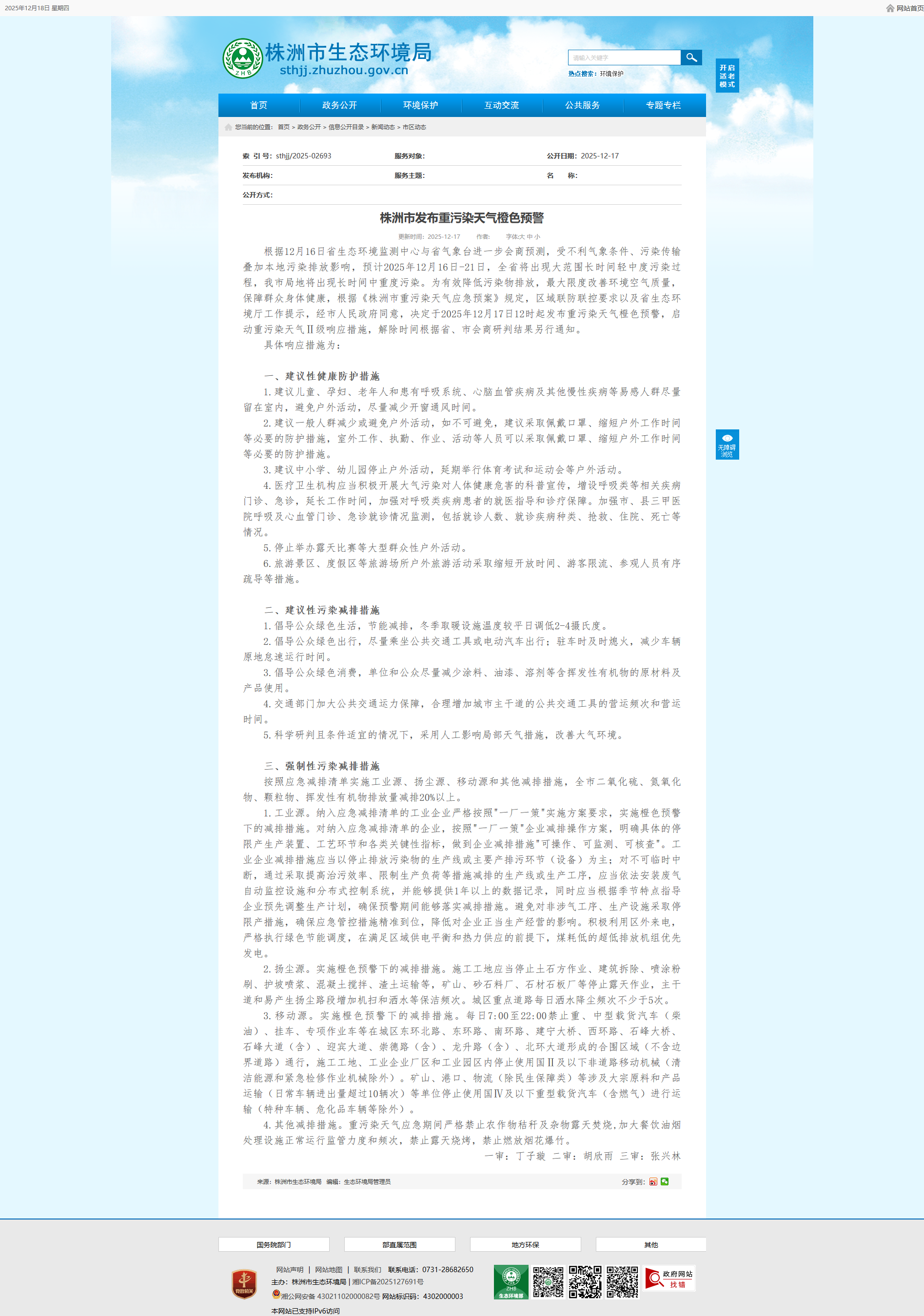 根据12月16日省生态环境监测中心与省气象台进一步会商预测,受不利气象条件、污染传输叠加本地污染排放影响,预计2025年12月16日-21日,全省将出现大范围长时间轻中度污染过程,我市局地将出现长时间中重度污染。为有效降低污染物排放,最大限度改善环境空气质量,保障群众身体健康,根据《株洲市重污染天气应急预案》规定,区域联防联控要求以及省生态环境厅工作提示,经市人民政府同意,决定于2025年12月17日12时起发布重污染天气橙色预警,启动重污染天气Ⅱ级响应措施,解除时间根据省、市会商研判结果另行通知。
