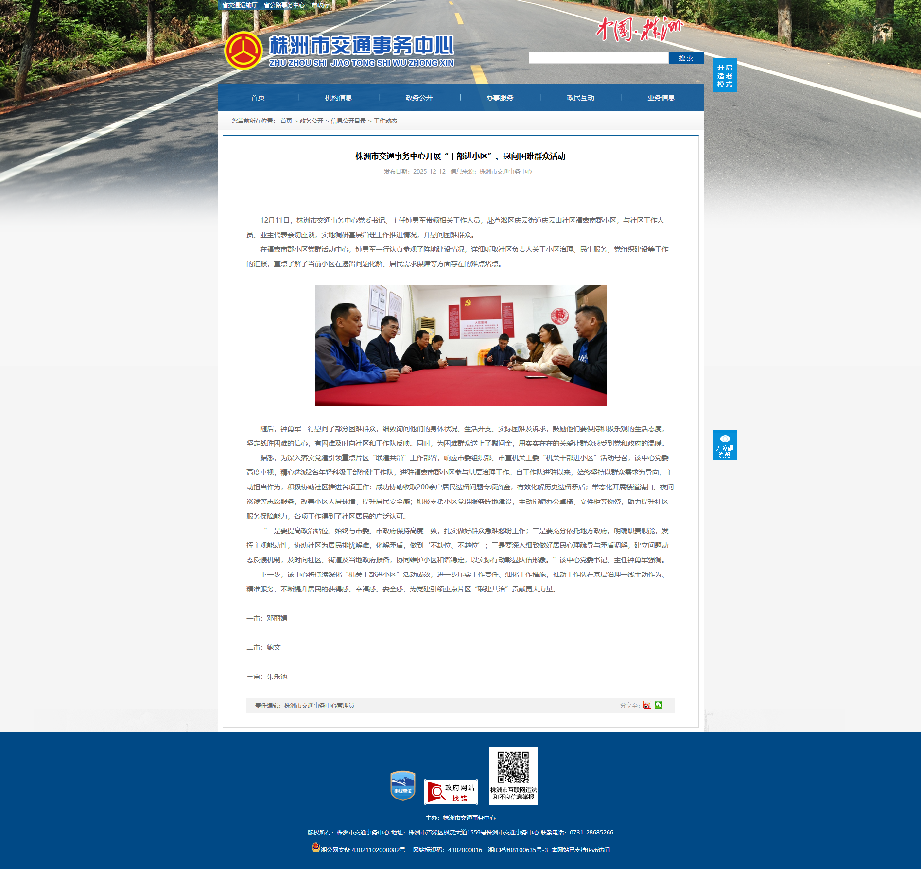 12月11日,株洲市交通事务中心党委书记、主任钟勇军带领相关工作人员,赴芦淞区庆云街道庆云山社区福鑫南郡小区,与社区工作人员、业主代表亲切座谈,实地调研基层治理工作推进情况,并慰问困难群众。
