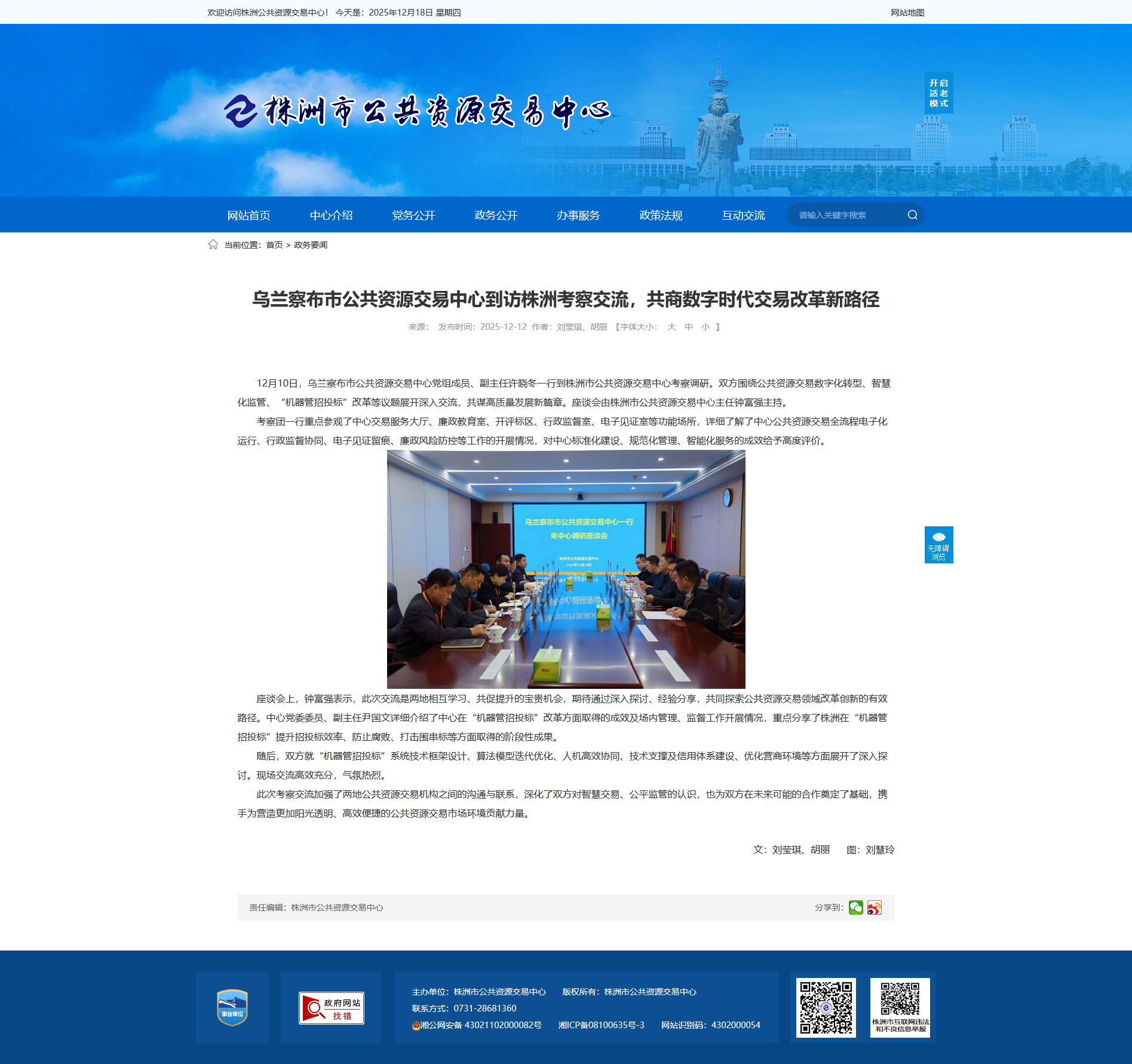 12月10日,乌兰察布市公共资源交易中心党组成员、副主任许晓冬一行到株洲市公共资源交易中心考察调研。双方围绕公共资源交易数字化转型、智慧化监管、“机器管招投标”改革等议题展开深入交流,共谋高质量发展新篇章。座谈会由株洲市公共资源交易中心主任钟富强主持。