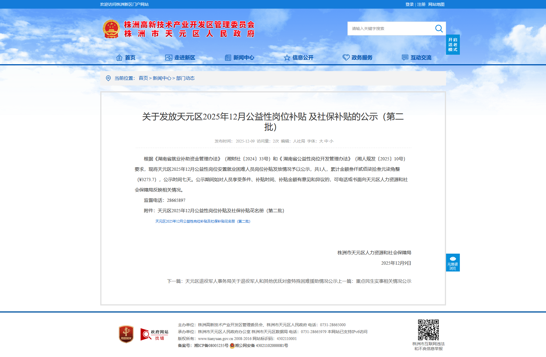 根据《湖南省就业补助资金管理办法》(湘财社〔2024〕33号)和《 湖南省公益性岗位开发管理办法》(湘人规发〔2025〕10号)要求,现将天元区2025年12月公益性岗位安置就业困难人员岗位补贴发放情况予以公示,共1人,累计金额叁仟贰佰柒拾叁元柒角整(¥3273.7),公示时间七天。公示期间如对人员享受条件、补贴时间、补贴金额有意见和异议的,可电话或书面向天元区人力资源和社会保障局反映相关情况。
