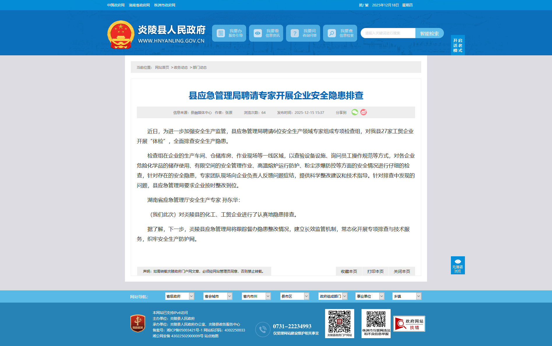 (我们此次)对炎陵县的化工、工贸企业进行了认真地隐患排查。