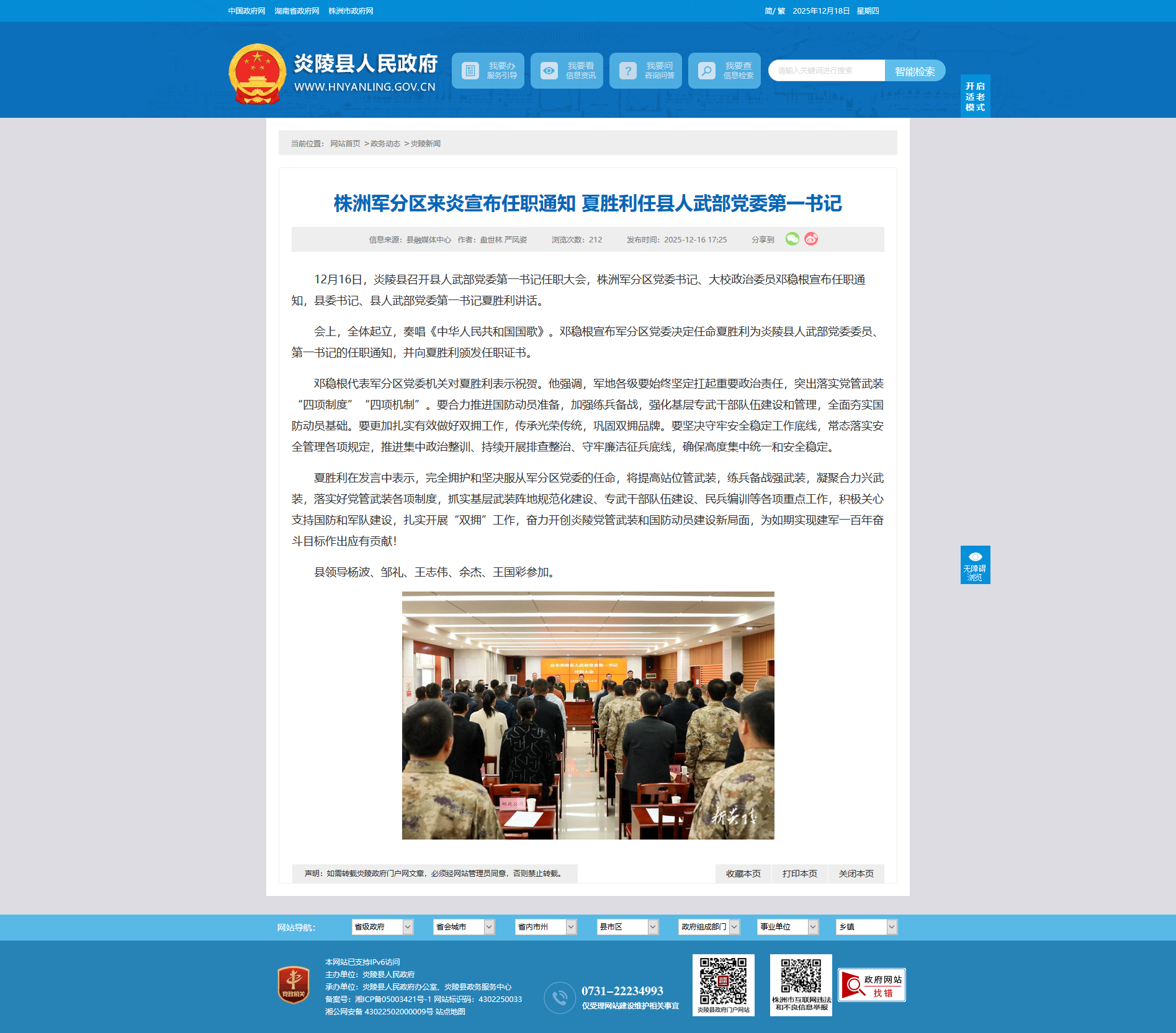 12月16日,炎陵县召开县人武部党委第一书记任职大会,株洲军分区党委书记、大校政治委员邓稳根宣布任职通知,县委书记、县人武部党委第一书记夏胜利讲话。