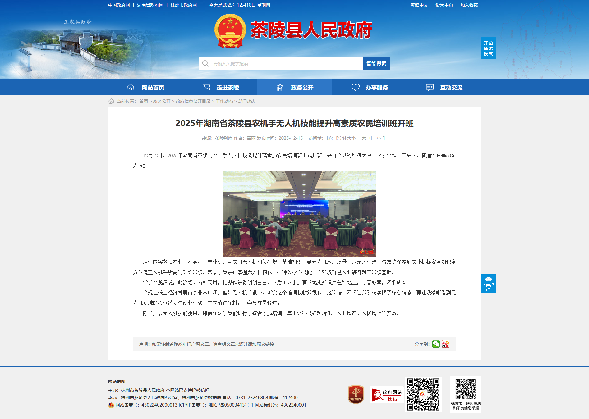 12月12日,2025年湖南省茶陵县农机手无人机技能提升高素质农民培训班正式开班,来自全县的种粮大户、农机合作社带头人、普通农户等50余人参加。