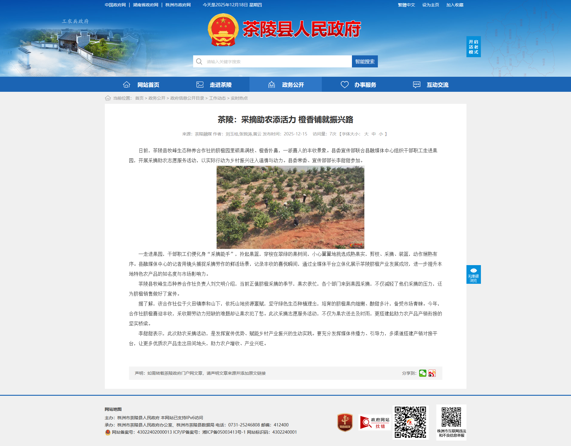茶陵县牧峰生态种养合作社负责人刘文明介绍,当前正值脐橙采摘的季节,果农很忙,各个部门来到果园采摘,不仅减轻了他们采摘的压力,还为脐橙销售做好了宣传。