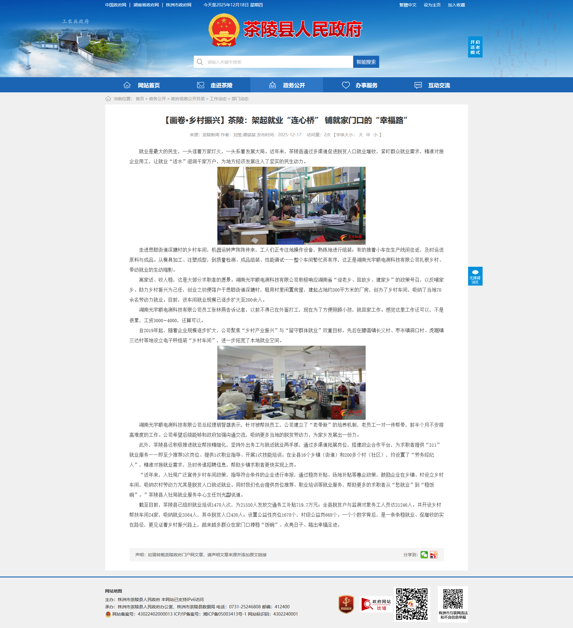 “近年来,人社局广泛宣传乡村车间政策,指导符合条件的企业进行申报,通过稳岗补贴、场地补贴等惠企政策,鼓励企业在乡镇、村设立乡村车间,吸纳农村劳动力尤其是脱贫人口就近就业。同时我们也会提供岗位推荐、职业培训等就业服务,帮助更多的求职者从“愁就业”到“稳饭碗”。”茶陵县人社局就业服务中心主任刘光酃说道。