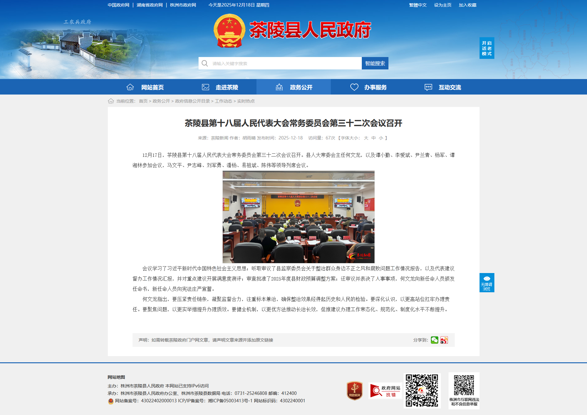 12月17日,茶陵县第十八届人民代表大会常务委员会第三十二次会议召开。县人大常委会主任何文龙,以及谭小勤、李爱斌、尹兰青、杨军、谭湘林参加会议,马文平、尹志峰、刘军勇、潘杨、易祖斌、陈伟等领导列席会议。