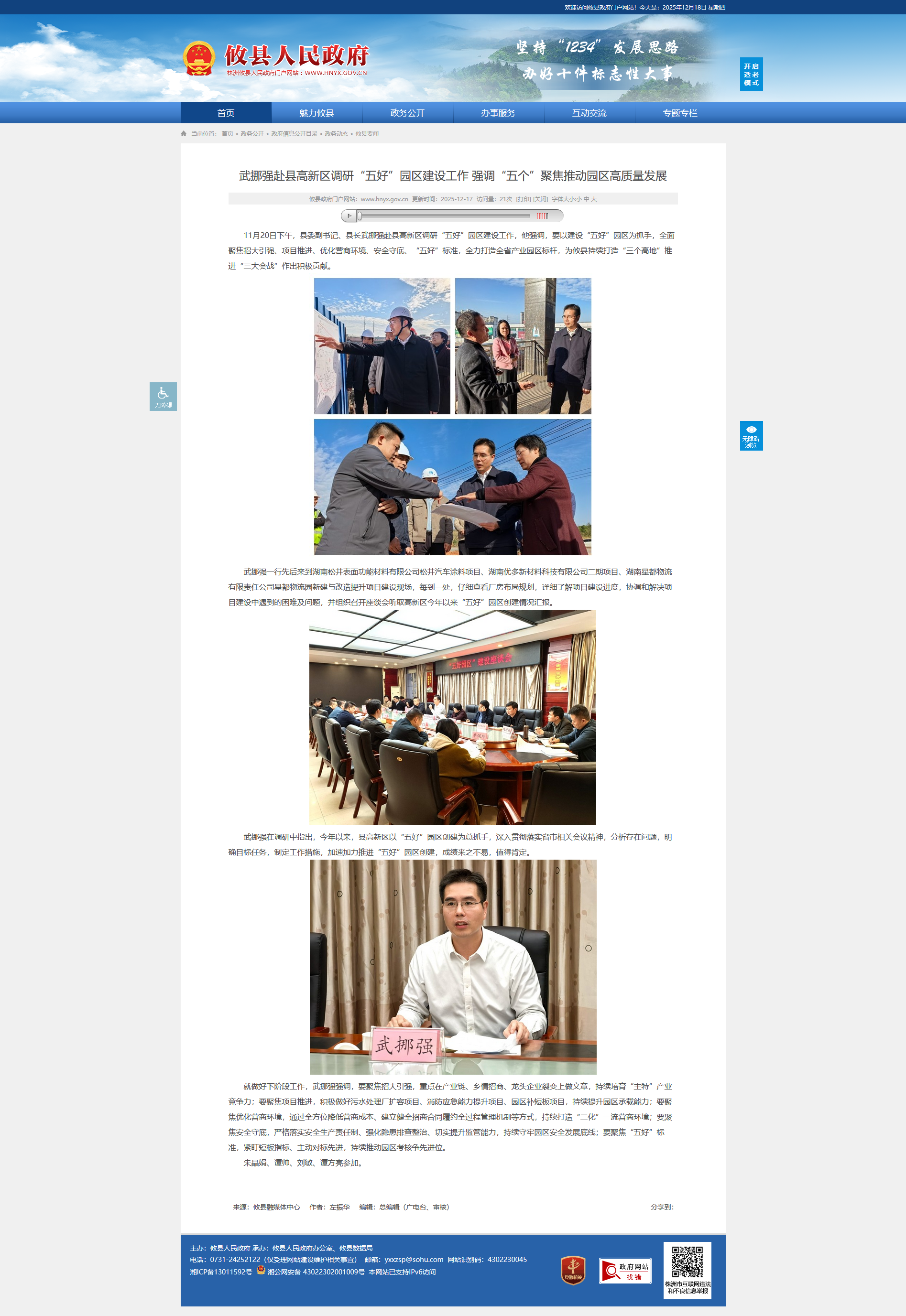11月20日下午,县委副书记、县长武挪强赴县高新区调研“五好”园区建设工作,他强调,要以建设“五好”园区为抓手,全面聚焦招大引强、项目推进、优化营商环境、安全守底、“五好”标准,全力打造全省产业园区标杆,为攸县持续打造“三个高地”推进“三大会战”作出积极贡献。