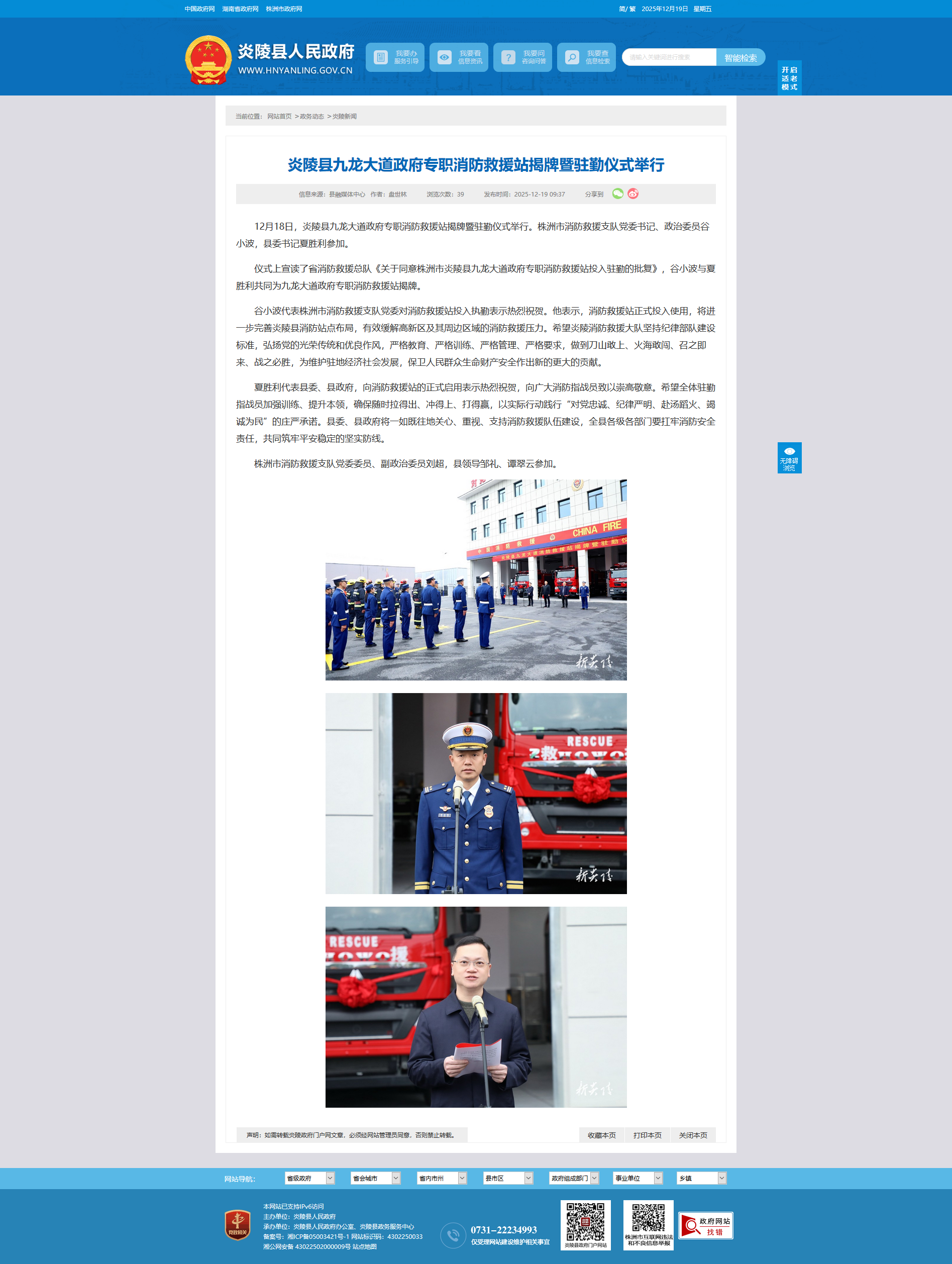 12月18日,炎陵县九龙大道政府专职消防救援站揭牌暨驻勤仪式举行。株洲市消防救援支队党委书记、政治委员谷小波,县委书记夏胜利参加。