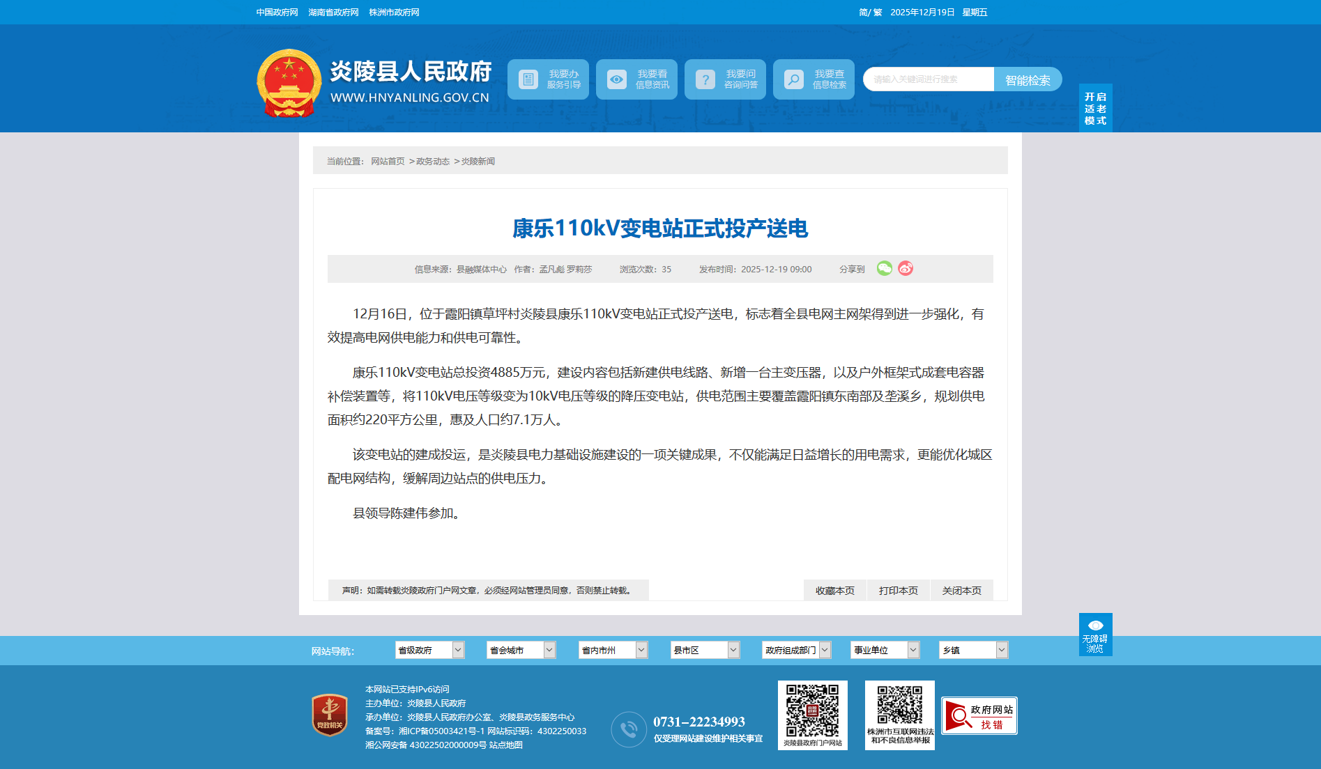 12月16日,位于霞阳镇草坪村炎陵县康乐110kV变电站正式投产送电,标志着全县电网主网架得到进一步强化,有效提高电网供电能力和供电可靠性。