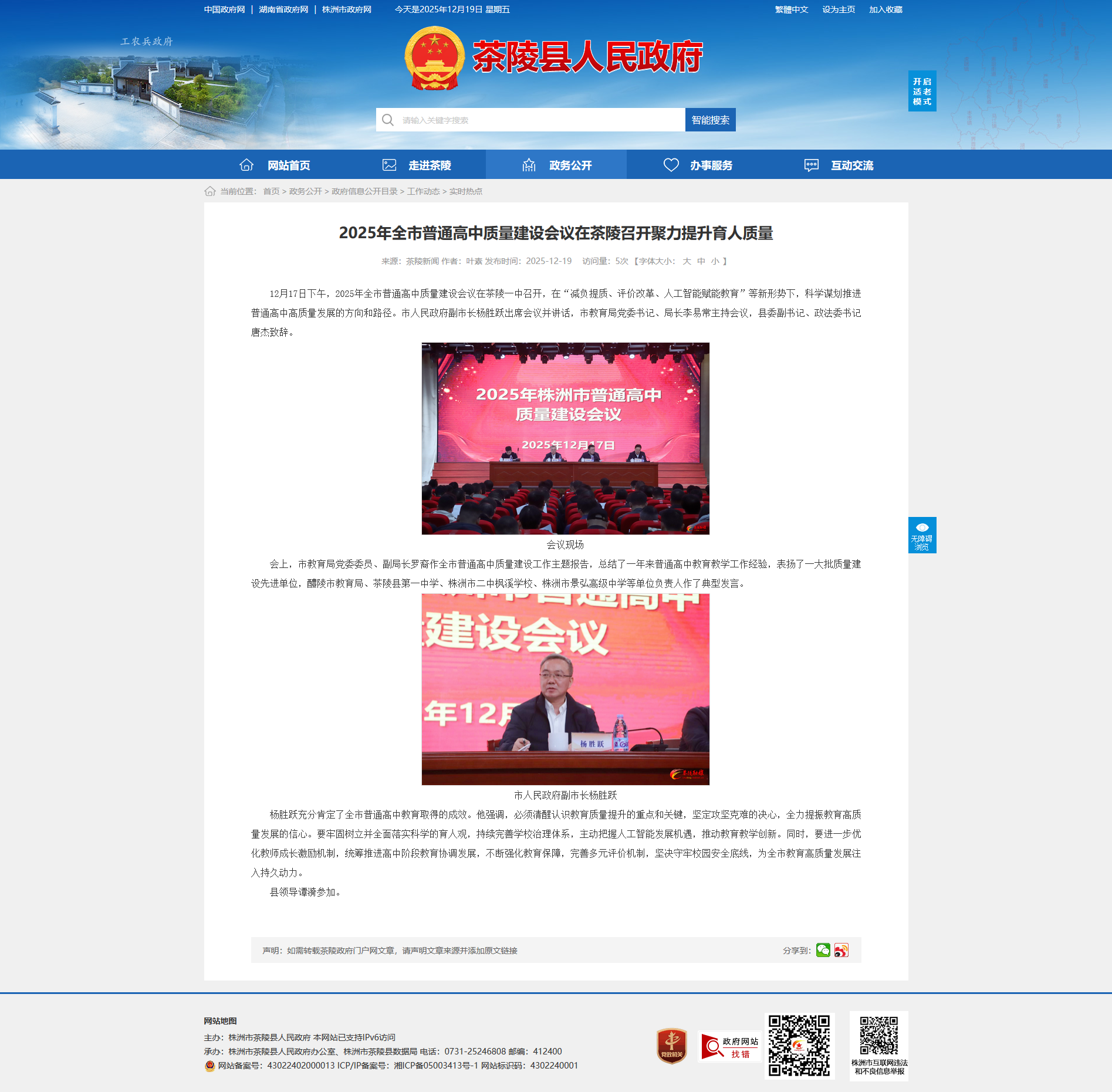 12月17日下午,2025年全市普通高中质量建设会议在茶陵一中召开,在“减负提质、评价改革、人工智能赋能教育”等新形势下,科学谋划推进普通高中高质量发展的方向和路径。市人民政府副市长杨胜跃出席会议并讲话,市教育局党委书记、局长李易常主持会议,县委副书记、政法委书记唐杰致辞。