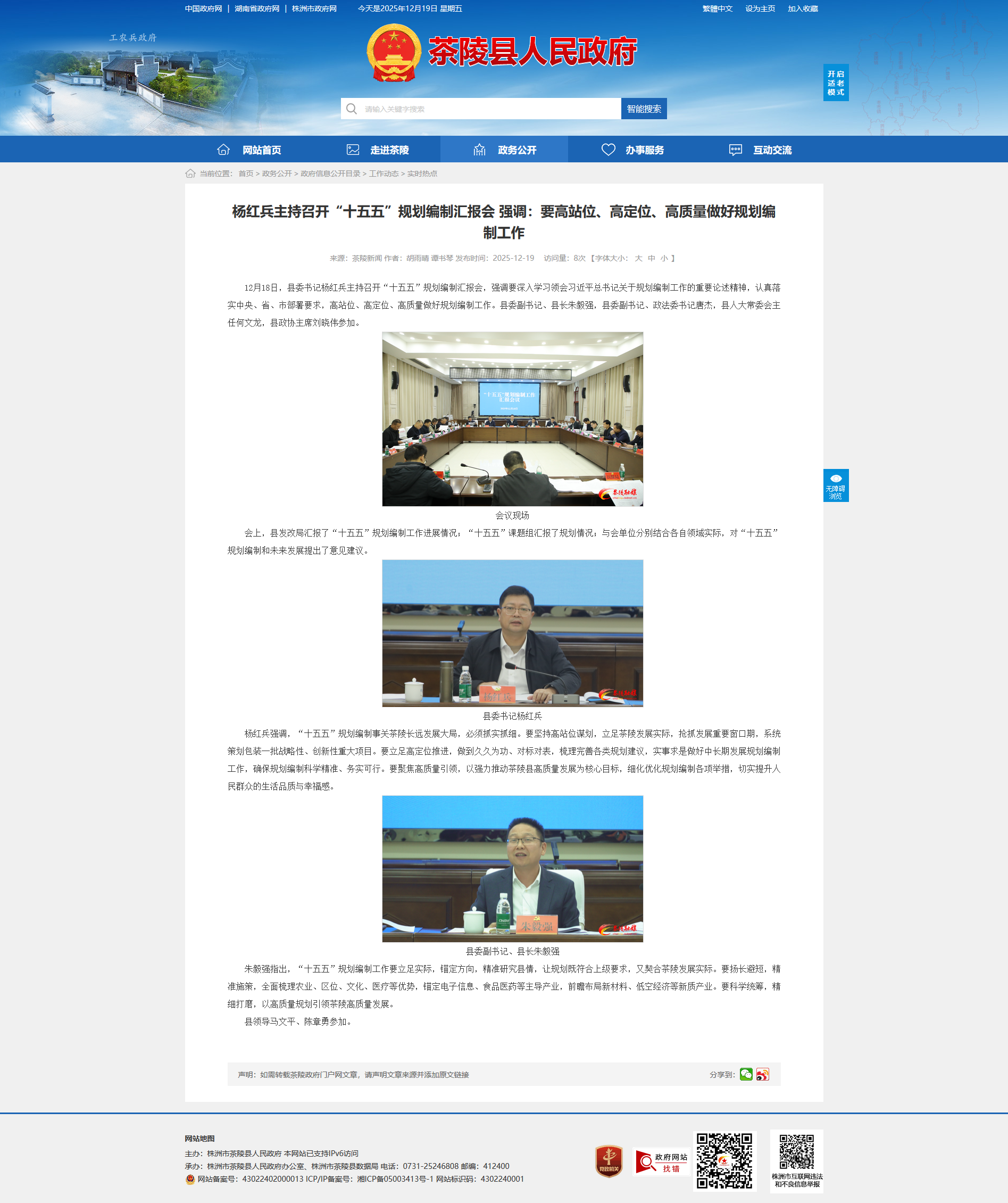 杨红兵强调,“十五五”规划编制事关茶陵长远发展大局,必须抓实抓细。要坚持高站位谋划,立足茶陵发展实际,抢抓发展重要窗口期,系统策划包装一批战略性、创新性重大项目。要立足高定位推进,做到久久为功、对标对表,梳理完善各类规划建议,实事求是做好中长期发展规划编制工作,确保规划编制科学精准、务实可行。要聚焦高质量引领,以强力推动茶陵县高质量发展为核心目标,细化优化规划编制各项举措,切实提升人民群众的生活品质与幸福感。