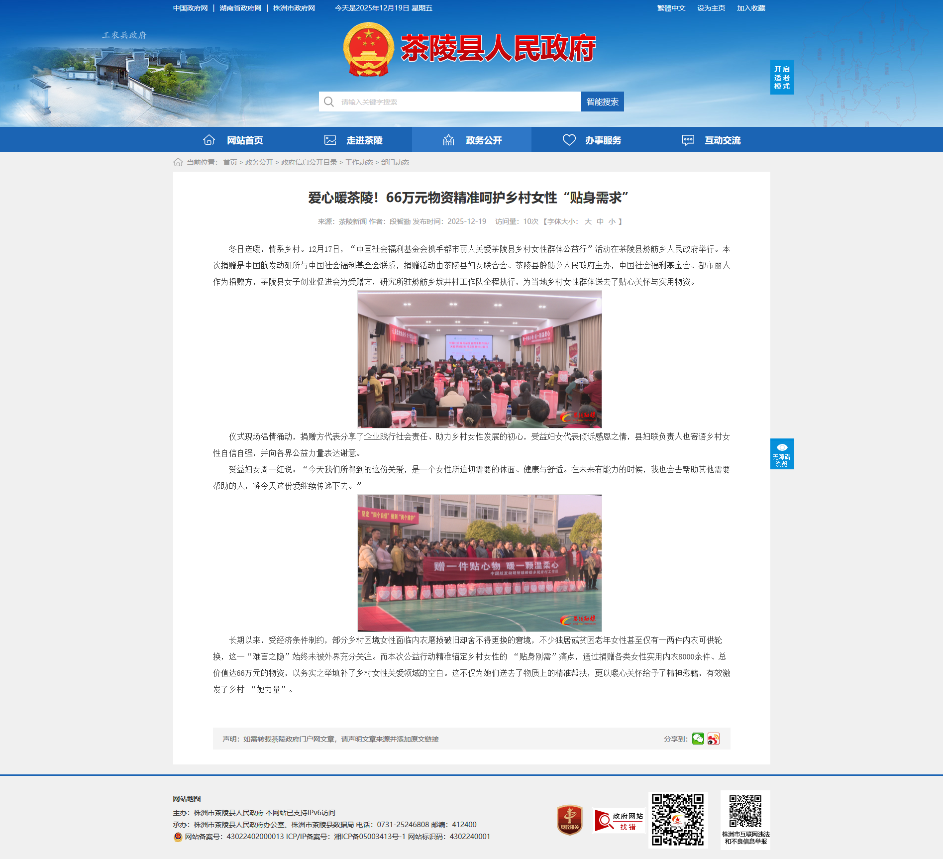 冬日送暖,情系乡村。12月17日,“中国社会福利基金会携手都市丽人关爱茶陵县乡村女性群体公益行”活动在茶陵县舲舫乡人民政府举行。本次捐赠是中国航发动研所与中国社会福利基金会联系,捐赠活动由茶陵县妇女联合会、茶陵县舲舫乡人民政府主办,中国社会福利基金会、都市丽人作为捐赠方,茶陵县女子创业促进会为受赠方,研究所驻舲舫乡垸井村工作队全程执行,为当地乡村女性群体送去了贴心关怀与实用物资。