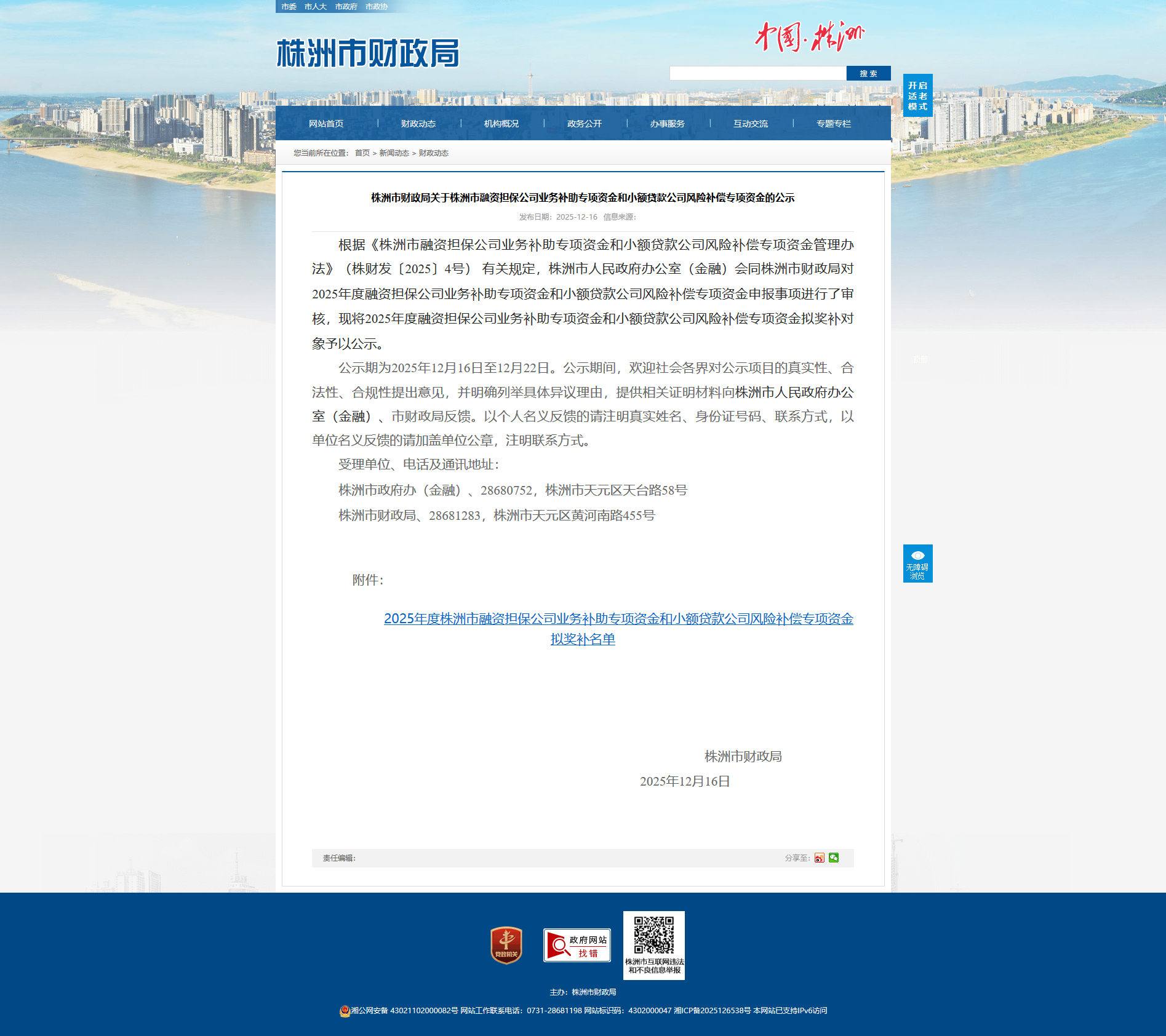 公示期为2025年12月16日至12月22日。公示期间,欢迎社会各界对公示项目的真实性、合法性、合规性提出意见,并明确列举具体异议理由,提供相关证明材料向株洲市人民政府办公室(金融)、市财政局反馈。以个人名义反馈的请注明真实姓名、身份证号码、联系方式,以单位名义反馈的请加盖单位公章,注明联系方式。