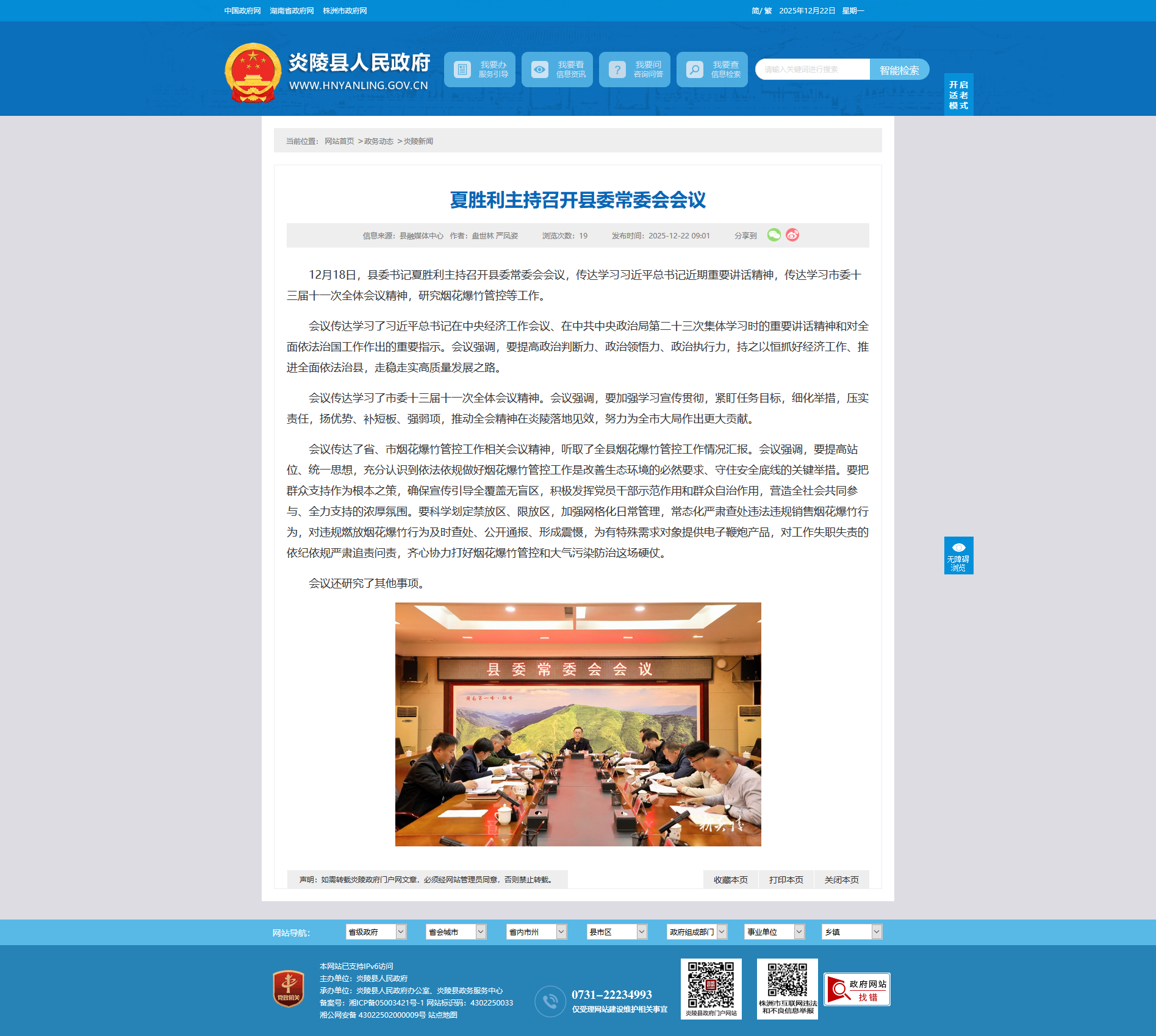 12月18日,县委书记夏胜利主持召开县委常委会会议,传达学习习近平总书记近期重要讲话精神,传达学习市委十三届十一次全体会议精神,研究烟花爆竹管控等工作。