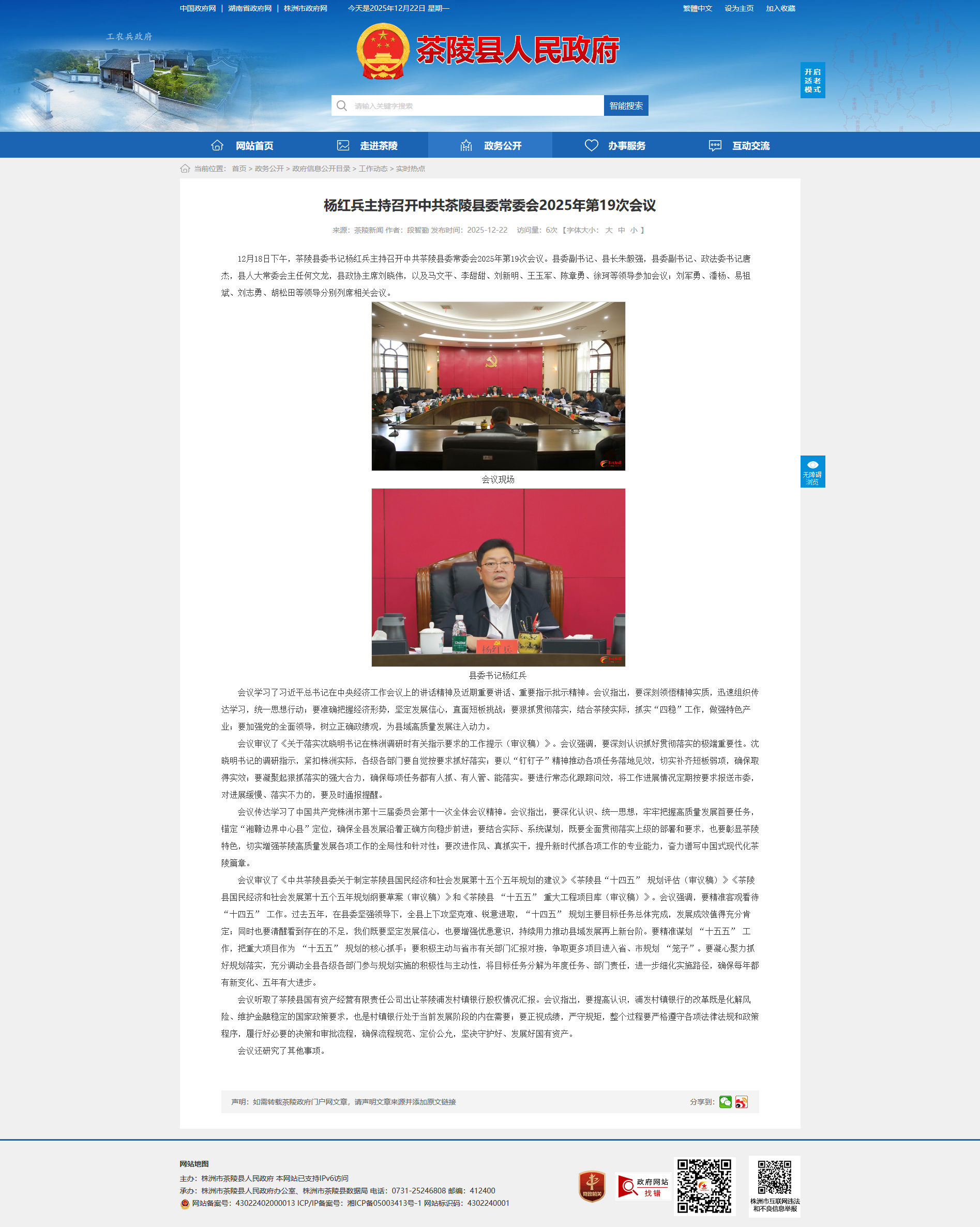 12月18日下午,茶陵县委书记杨红兵主持召开中共茶陵县委常委会2025年第19次会议。县委副书记、县长朱毅强,县委副书记、政法委书记唐杰,县人大常委会主任何文龙,县政协主席刘晓伟,以及马文平、李甜甜、刘新明、王玉军、陈章勇、徐珂等领导参加会议;刘军勇、潘杨、易祖斌、刘志勇、胡松田等领导分别列席相关会议。