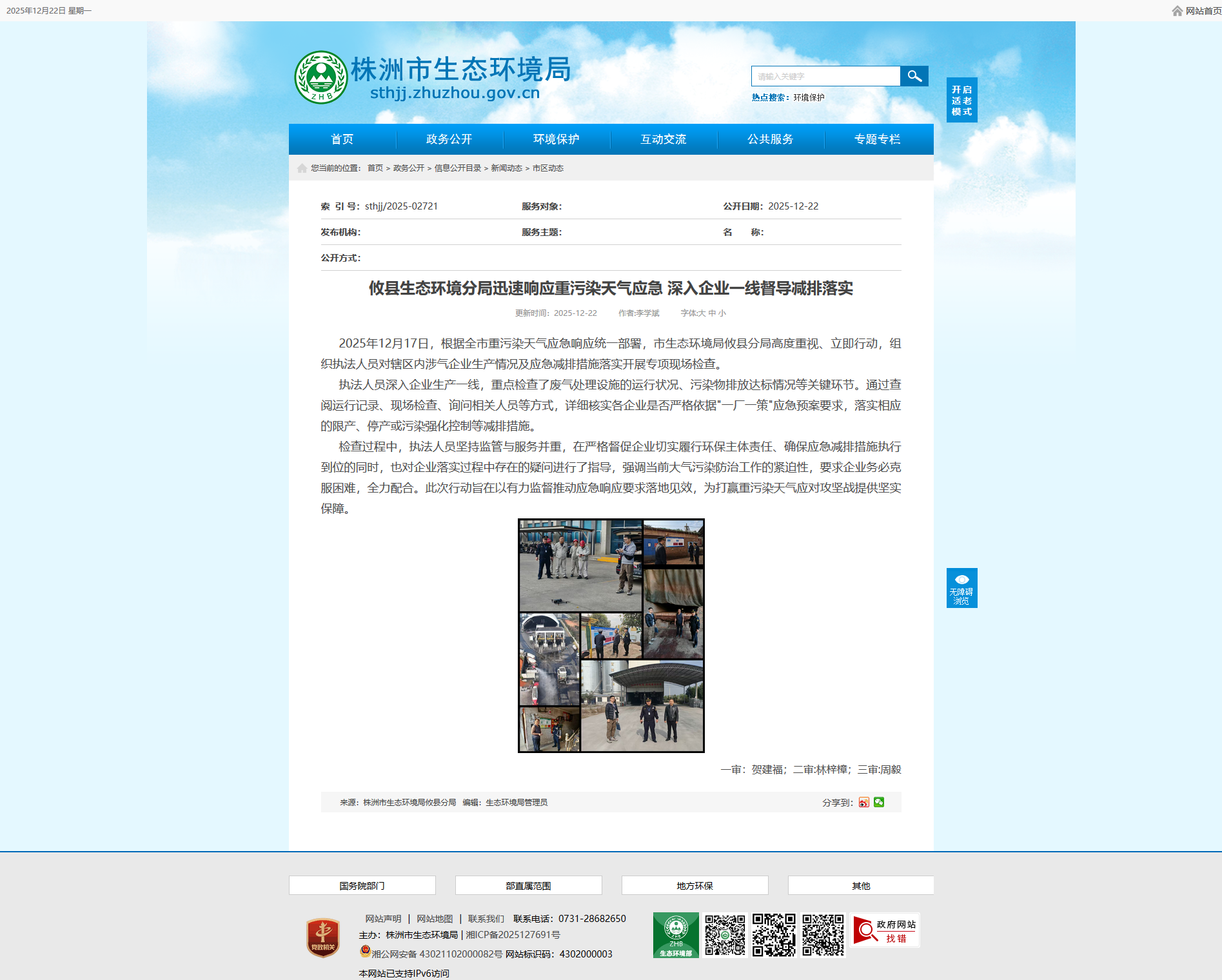 2025年12月17日,根据全市重污染天气应急响应统一部署,市生态环境局攸县分局高度重视、立即行动,组织执法人员对辖区内涉气企业生产情况及应急减排措施落实开展专项现场检查。