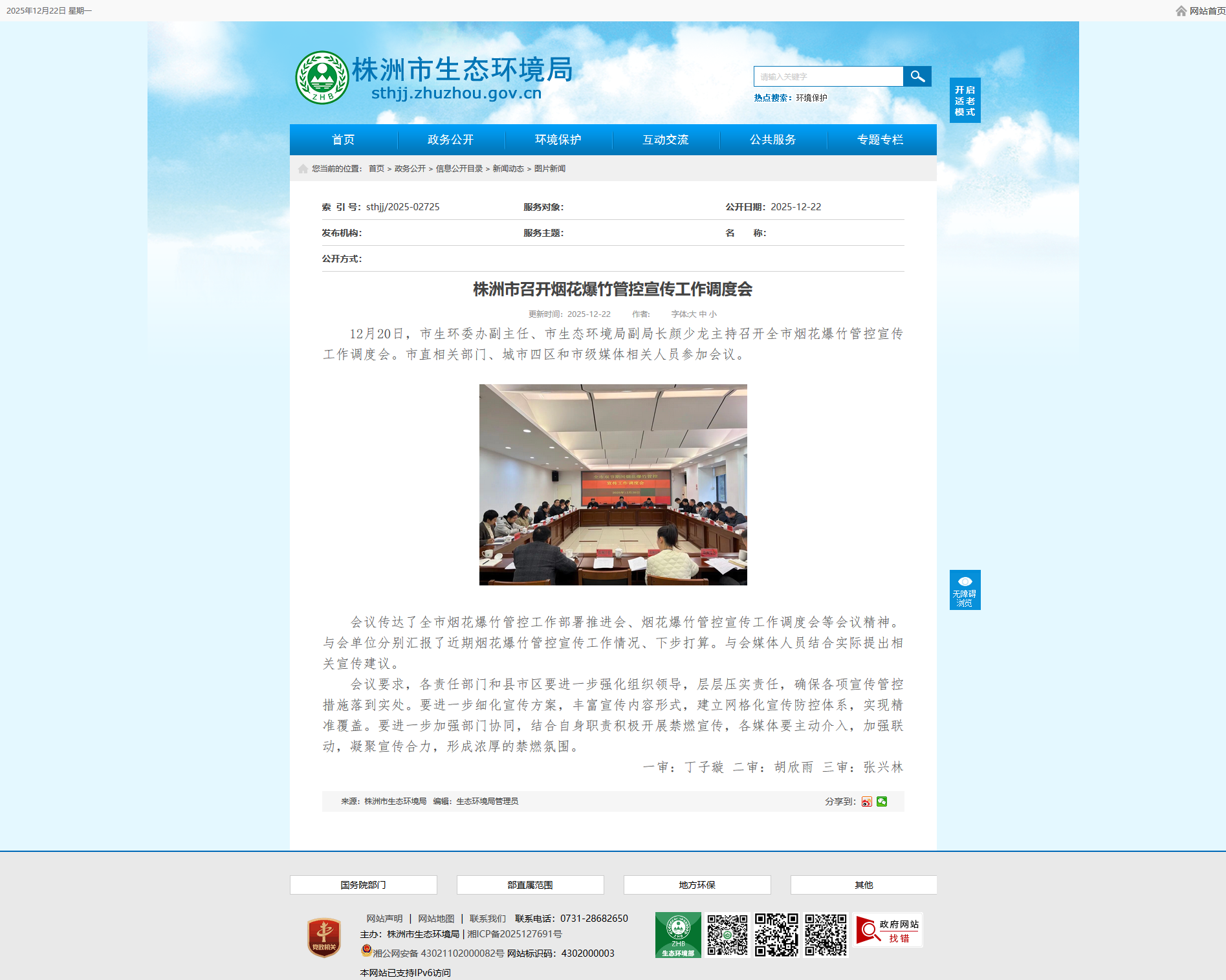 12月20日,市生环委办副主任、市生态环境局副局长颜少龙主持召开全市烟花爆竹管控宣传工作调度会。市直相关部门、城市四区和市级媒体相关人员参加会议。