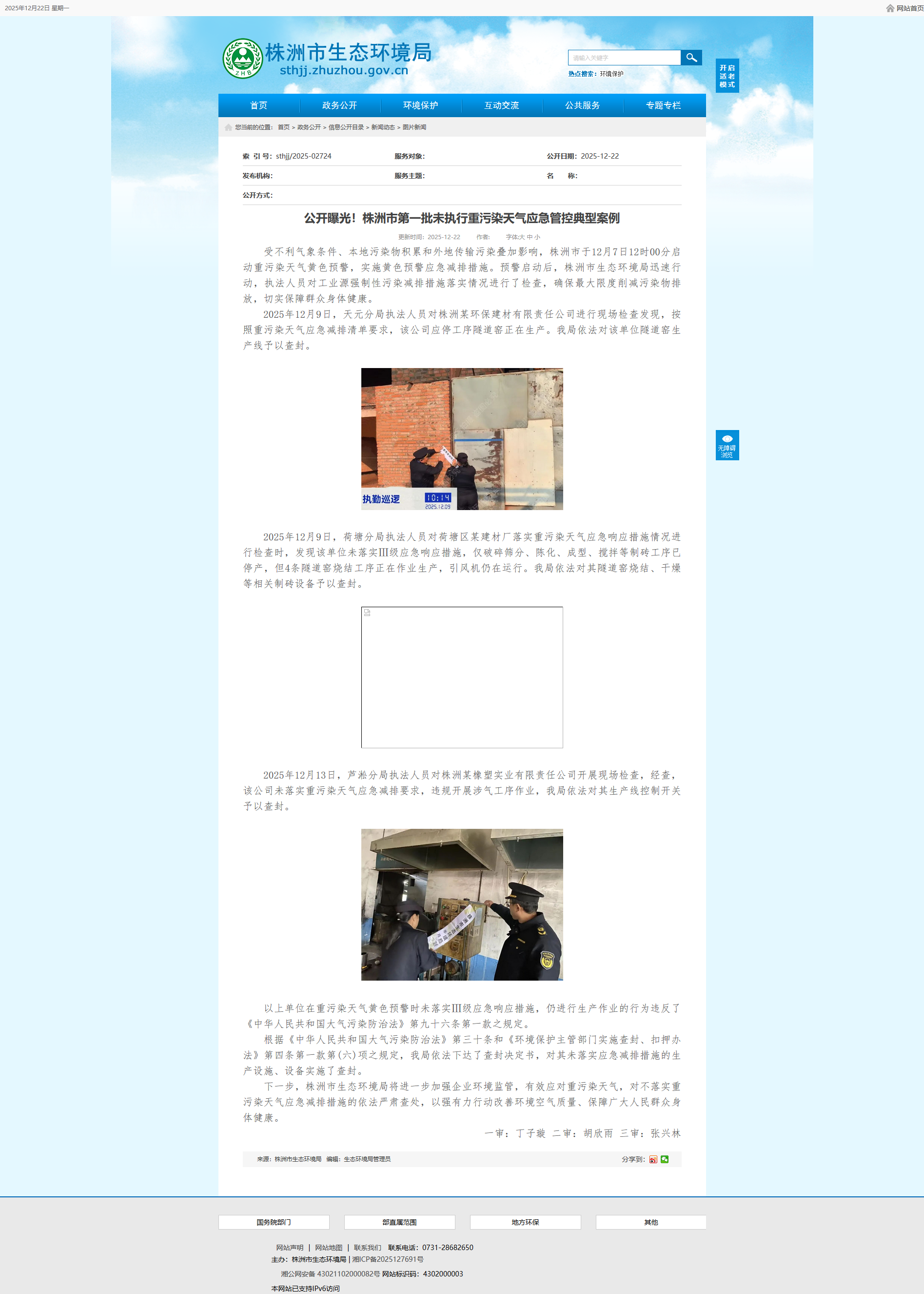 受不利气象条件、本地污染物积累和外地传输污染叠加影响,株洲市于12月7日12时00分启动重污染天气黄色预警,实施黄色预警应急减排措施。预警启动后,株洲市生态环境局迅速行动,执法人员对工业源强制性污染减排措施落实情况进行了检查,确保最大限度削减污染物排放,切实保障群众身体健康。