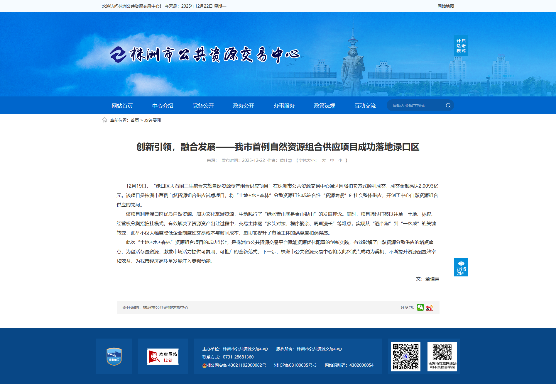 此次“土地 水 森林”资源组合项目的成功出让,是株洲市公共资源交易平台赋能资源优化配置的创新实践,有效破解了自然资源分散供应的堵点痛点,为盘活存量资源、激发市场活力提供可复制、可推广的全新范式。下一步,株洲市公共资源交易中心将以此次试点成功为契机,不断提升资源配置效率和效益,为我市经济高质量发展注入更强动能。